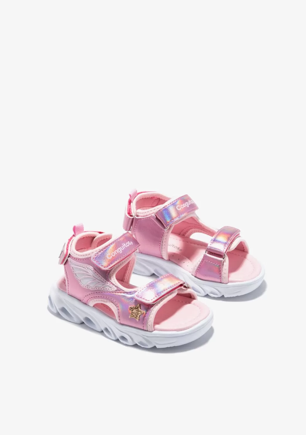 Estas sandalias están confeccionadas en material metalizado rosa y plateado. Tiene tiras adherentes y ajustables en la parte delantera y talón para mayor comodidad. Están decoradas con estrellas plateadas, un ala de unicornio y luces.