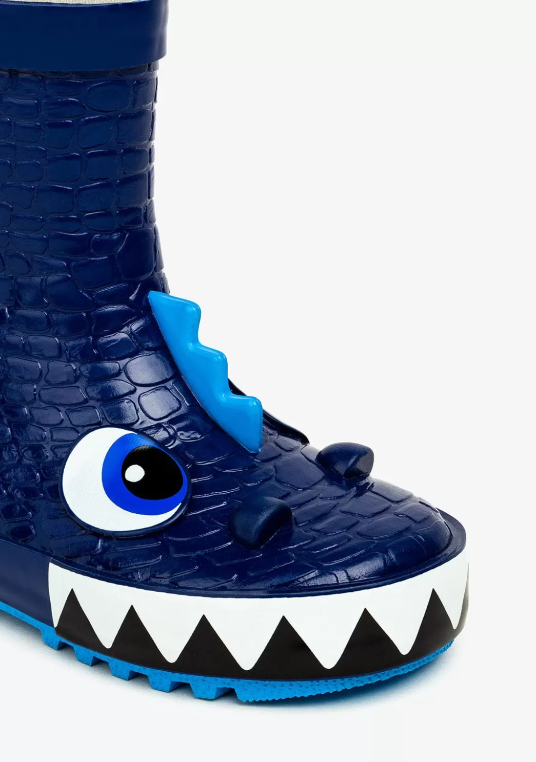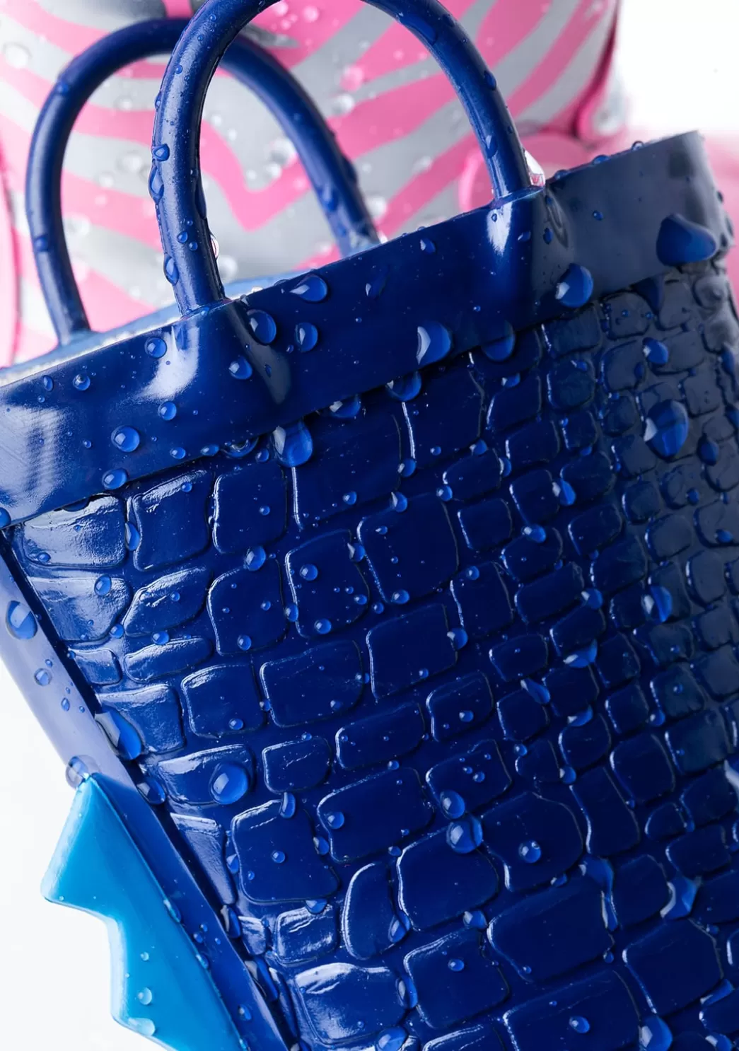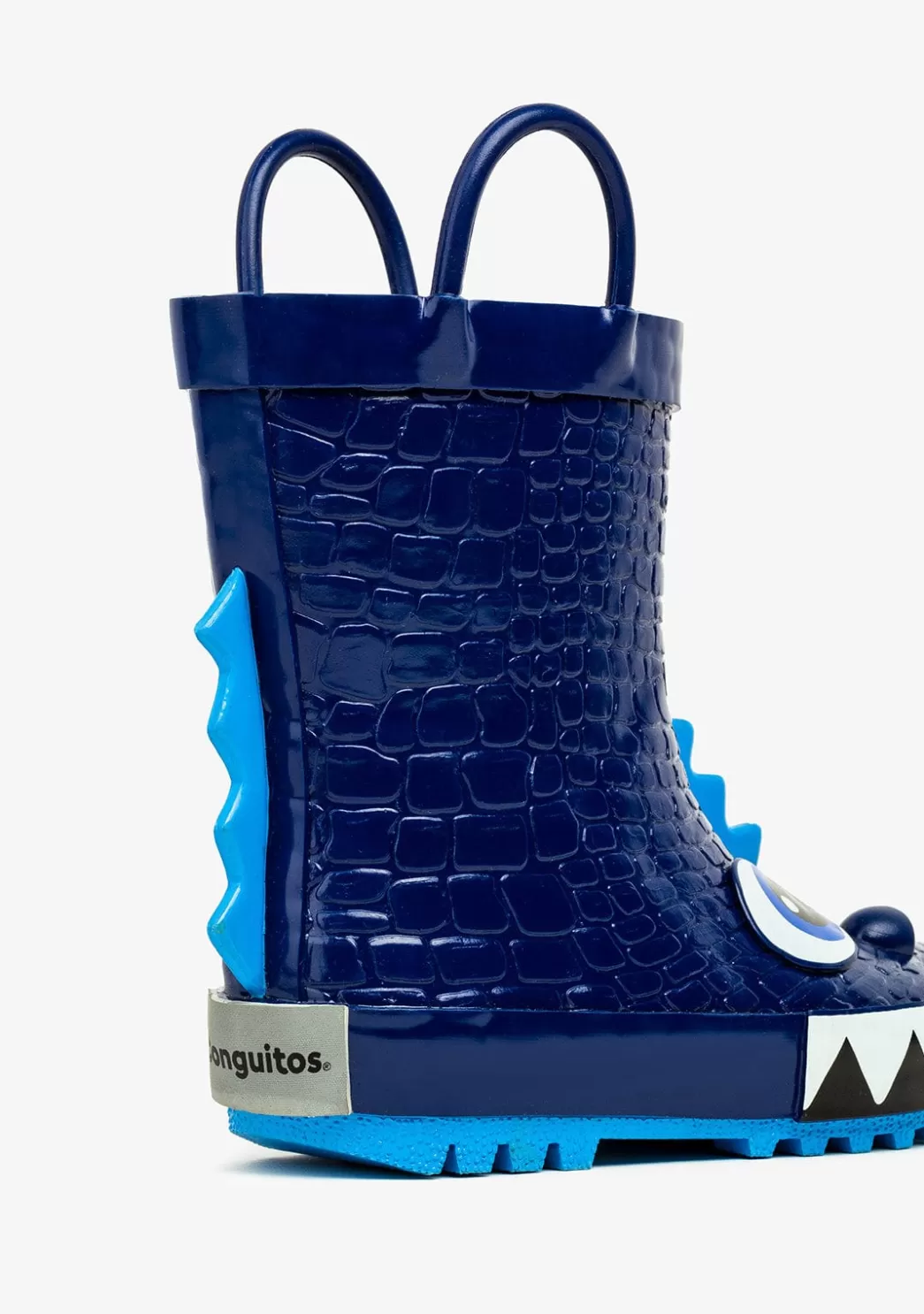 Botas de agua en color azul fabricadas con materiales de goma impermeable con detalles de dinosaurio. ¡Las botas más divertidas para pisar charcos! Tienen una suela dentada antideslizante con asas en la zona superior para facilitar su uso. Con detalles de dinosaurios. Con interior forrado para aislar del frío y mayor confort en la pisada.