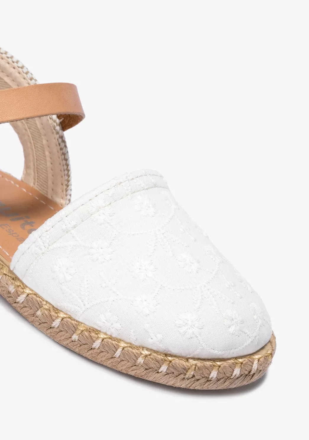 Alpargatas blancas con detalles marrones. Tienen la parte delantera cerrada y están confeccionadas en tejido blanco con margaritas bordadas. Tienen una pulsera marrón con hebilla para una mejor sujeción al pie.