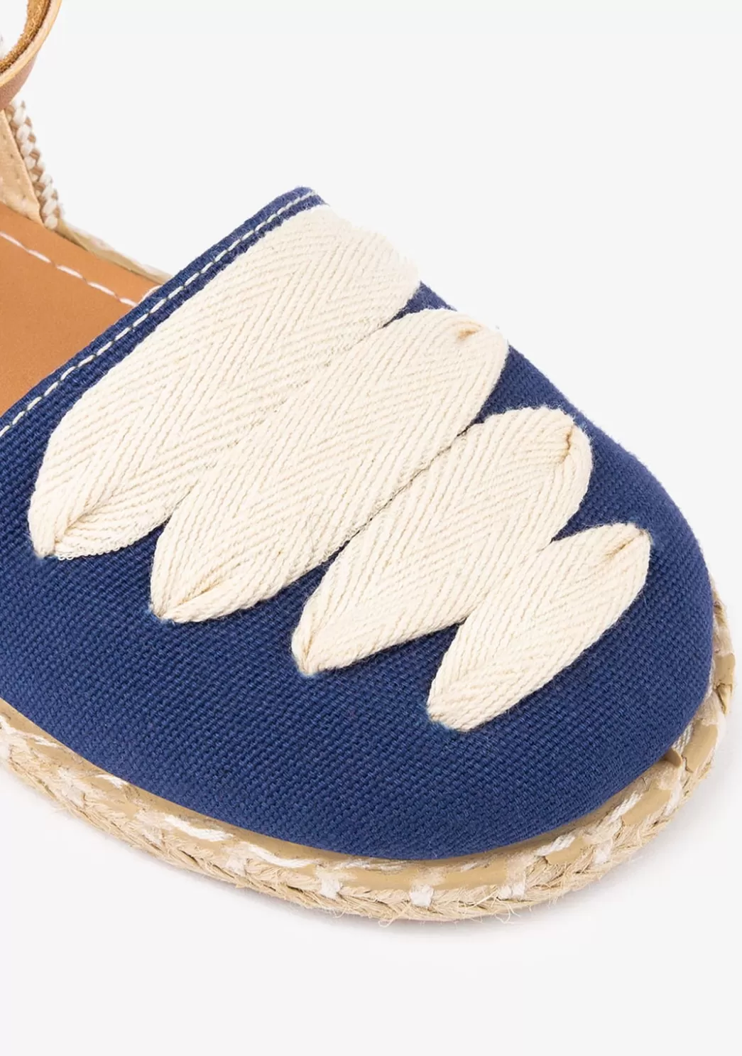 Alpargatas de niña confeccionadas en tela de color azul, con detalle de cordones cruzados, suela de yute y cierre de pulsera con hebilla en color marrón. La planta garantiza la transpirabilidad del pie y un gran comodidad interior, además de la suela de goma que facilita la comodidad que necesitamos para nuestros pies. Unas sandalias fresquitas y cómodas ideales para la primavera y el verano.