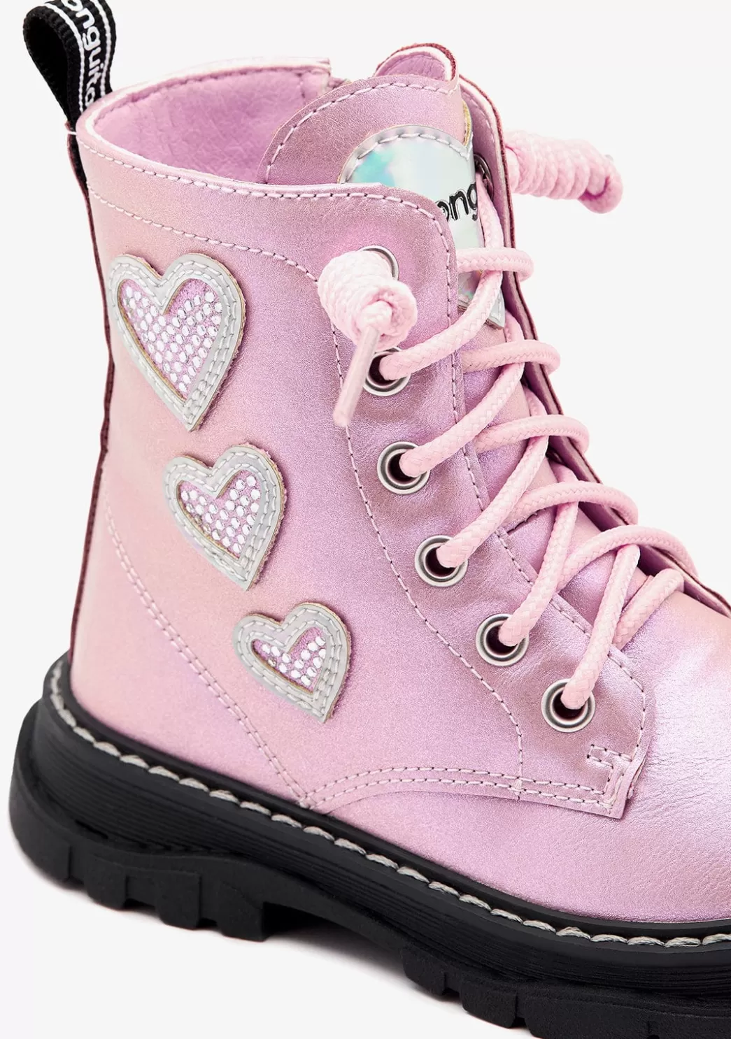 Este diseño en acabado rosa está confeccionado con materiales sintéticos de alta calidad. Cuenta con un cierre de lazada que permite un ajuste perfecto. Además, también presenta cremallera interior y un diseño de corazones con detalles de brillos.