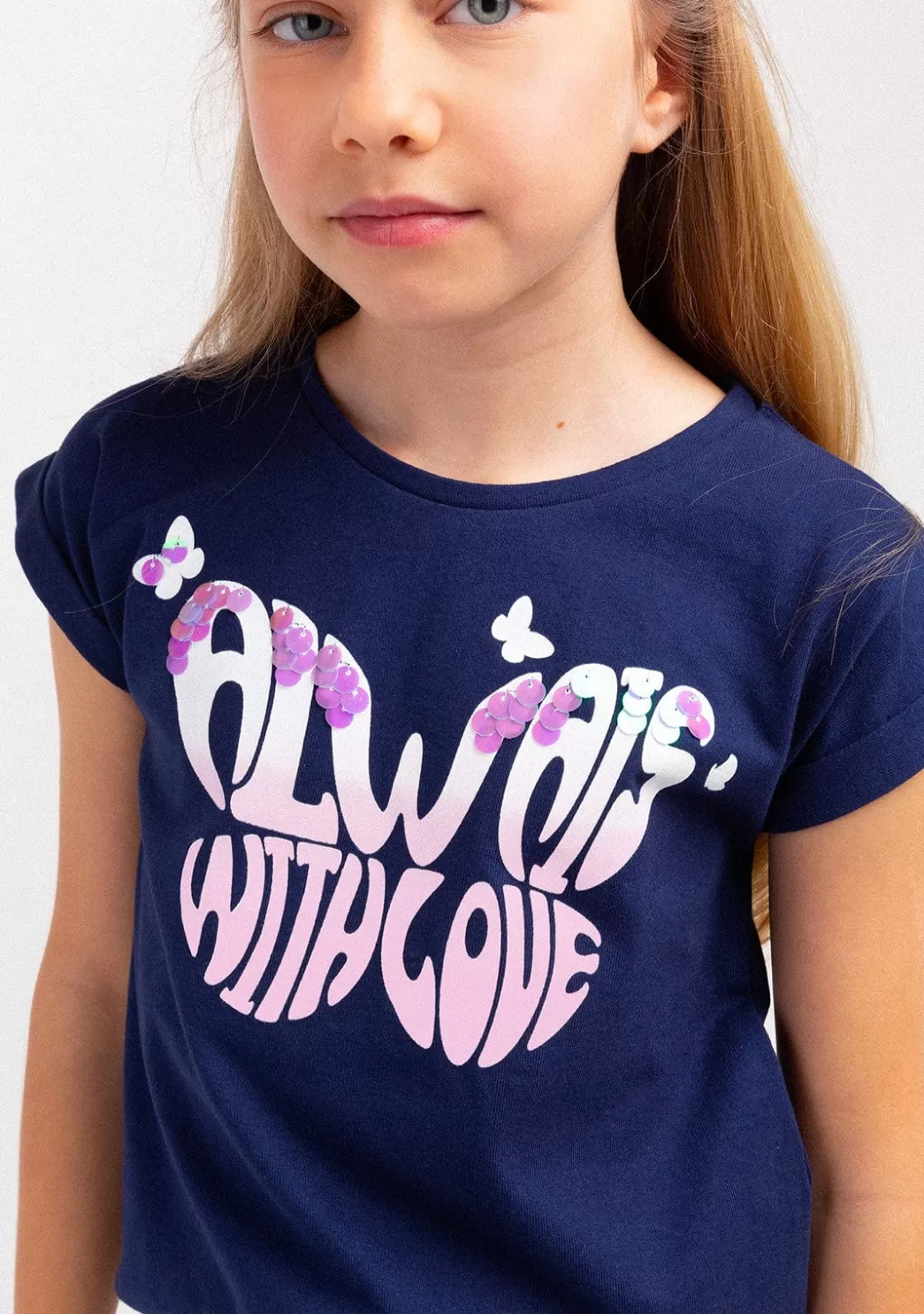 Nueva camiseta de manga corta para niña en color azul marino. Diseño de mariposa con grandes lentejuelas. Perfecta para que las niñas vayan monas y fresquitas este verano.