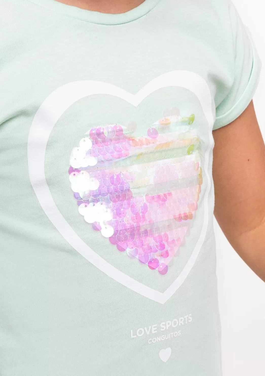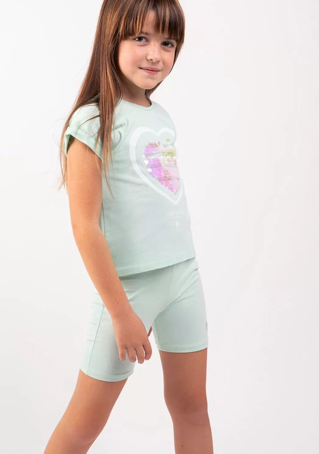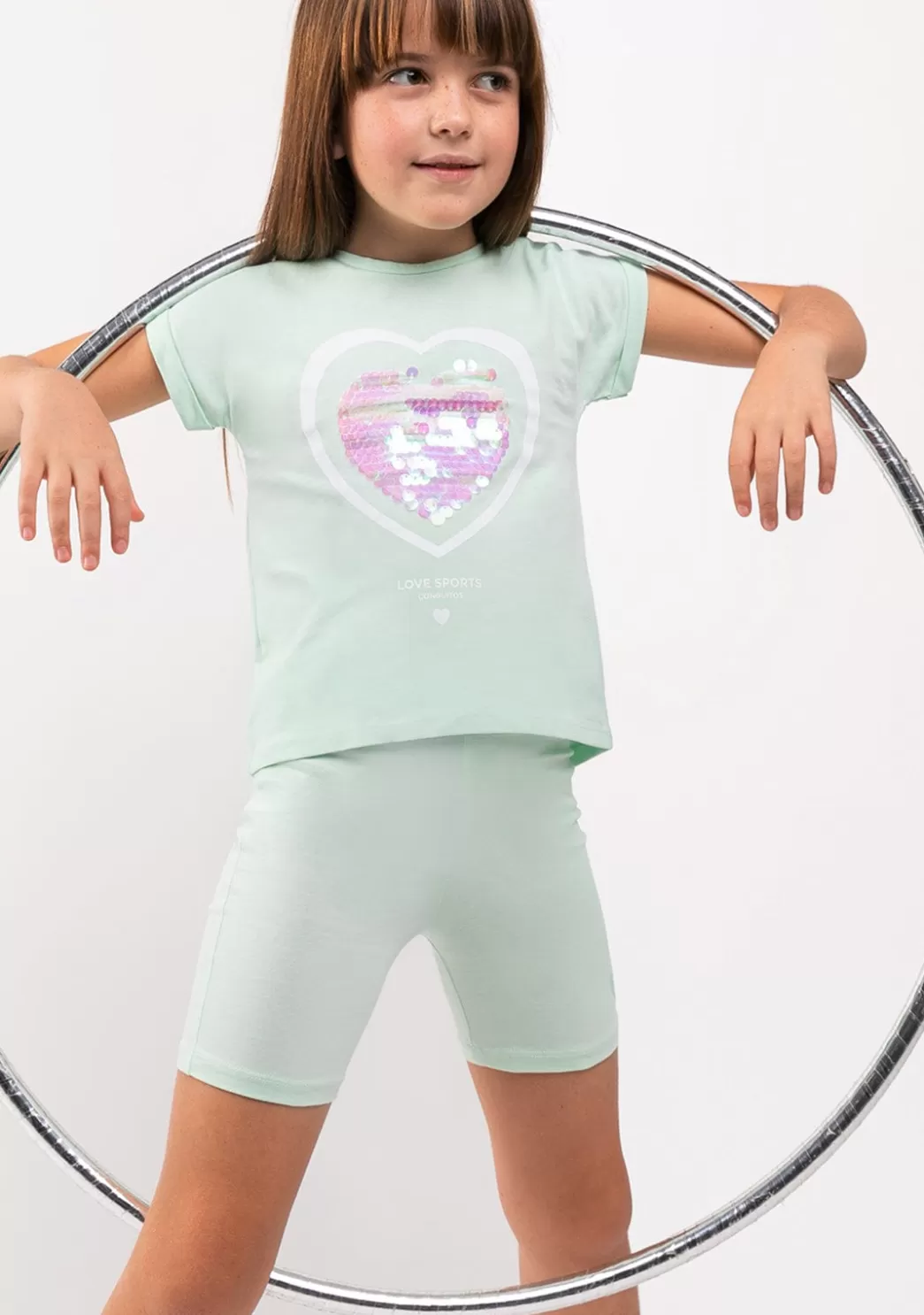 Nuevo conjunto de dos piezas de color menta compuesto por una camiseta de manga corta y un pantalón corto estilo ciclista. La camiseta es de patrón corto y tiene un diseño de un corazón con muchas lentejuelas. El pantalón queda por encima de la rodilla y es ajustado. Te hará sentir cómoda y guapa, la combinación perfecta para este verano.