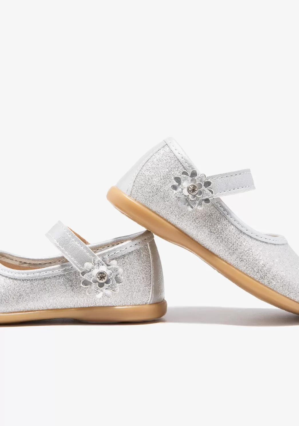 Este modelo de bailarinas plateadas con glitter cuenta con una tira que mejora la sujeción al pie. También, tiene decoración de estrellas y flores en la tira del cierre, así como un ribete dorado en el borde del zapato. Están fabricadas en España.