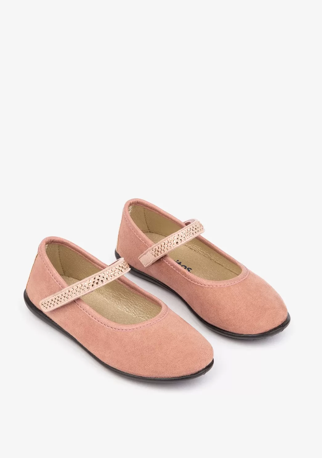 Bailarinas de niña fabricadas en material de ante sintético con pedrería y banda para una mejor sujeción. Estos zapatos planos tienen una suela de goma para el máximo confort de la niña. Las bailarinas perfectas para tu niña.