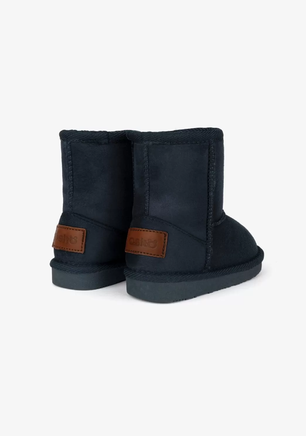 Botas australianas para bebés en color azul marino fabricado con la tecnlogía water repellent en material repelente al agua, haciendo que el agua quede en el exterior y no se filtre hacia el interior de la bota. Tiene el forro interior de pelo, con detalle en el talón de etiqueta de Osito by Conguitos y suela de goma. Unas botas totalmente unisex perfectas para los días de más frío y e incluso de lluvia del invierno.