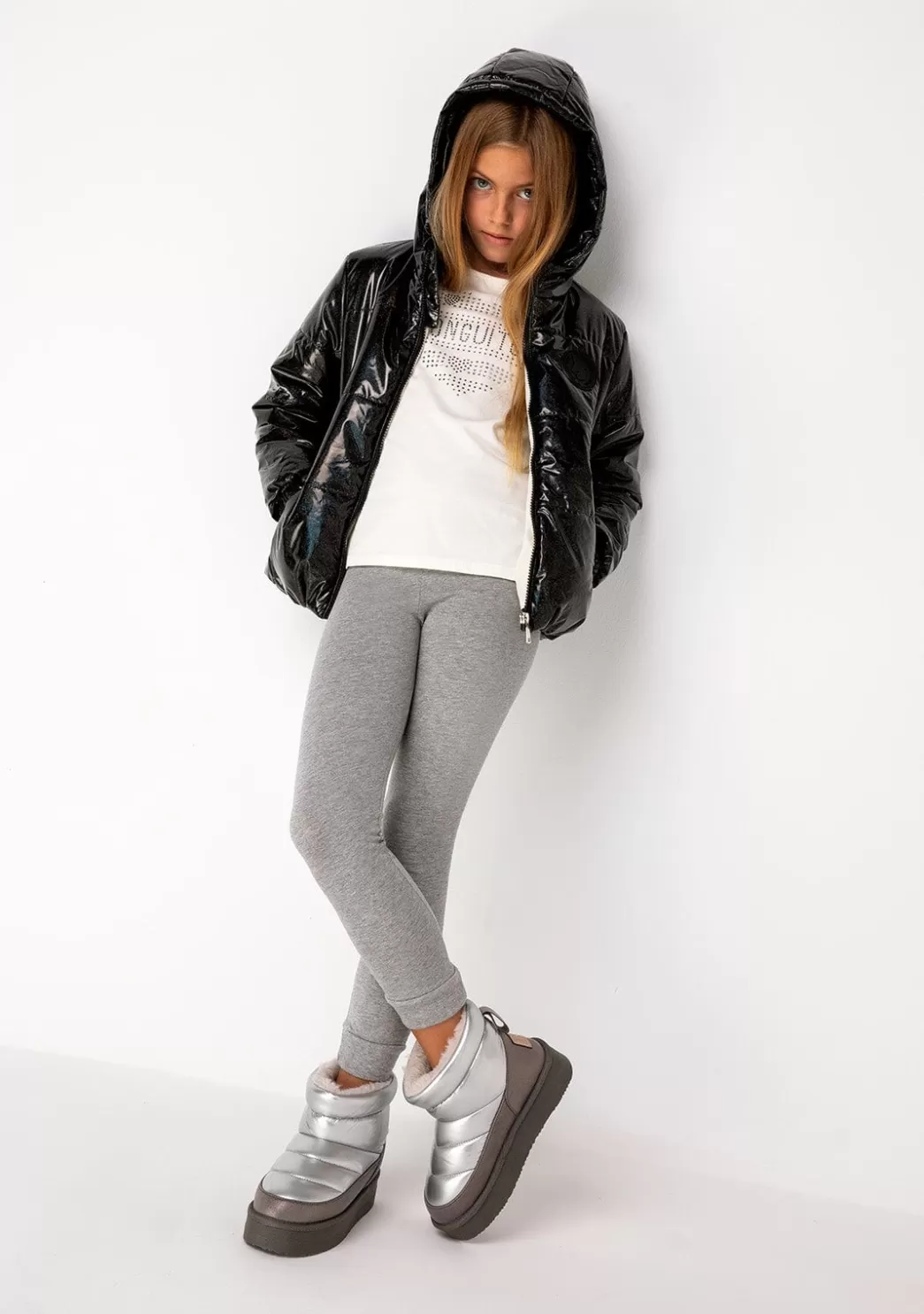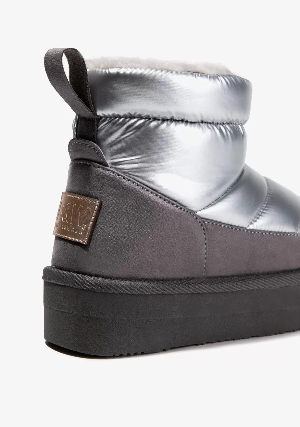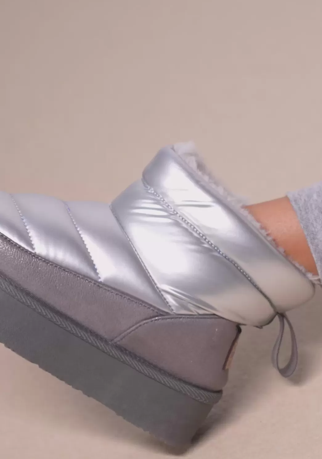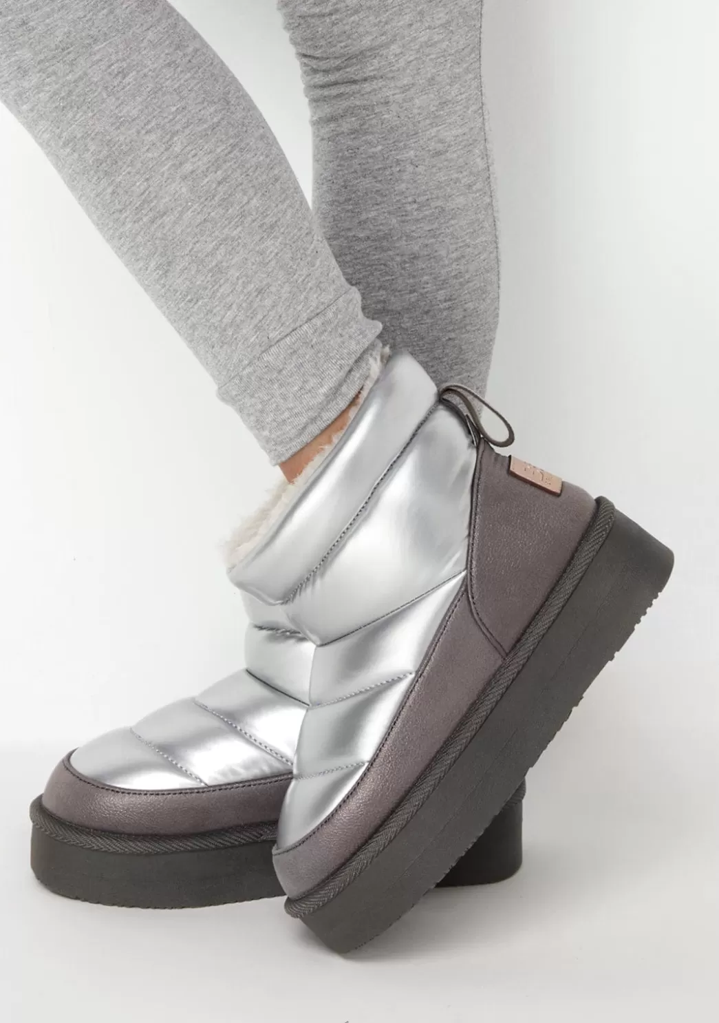 El modelo color plata cuenta con un forro interior de pelo que proporciona calidez necesaria para los días más fríos de invierno. Además, los materiales de alta calidad y su suela de doble piso aíslan los pies del frío suelo.