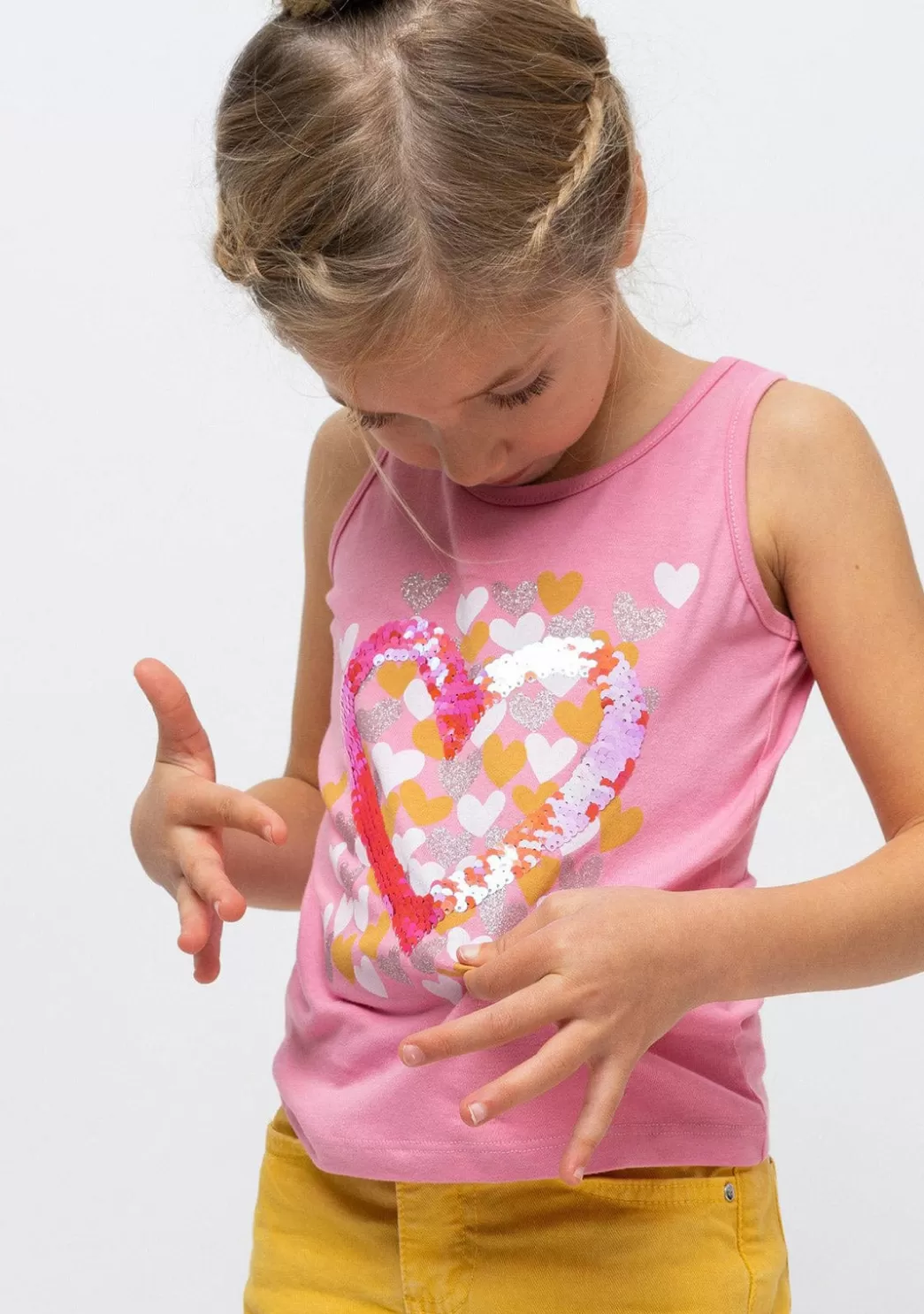 Camiseta de tirantes para niña de color rosa confeccionada en algodón y spándex. La camiseta más fresquita para los días de calor con print de corazones en la zona delantera, combinados en color rosa, dorado y rosa con efecto purpurina. Sobre el estampado de corazones hay un gran corazón de lentejuelas reversibles en color rojo y por el otro lado en negro.