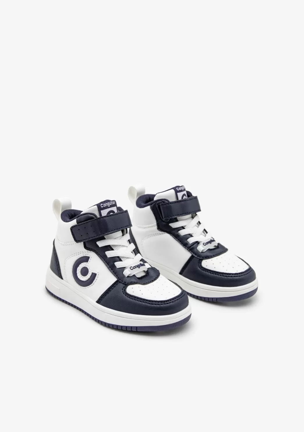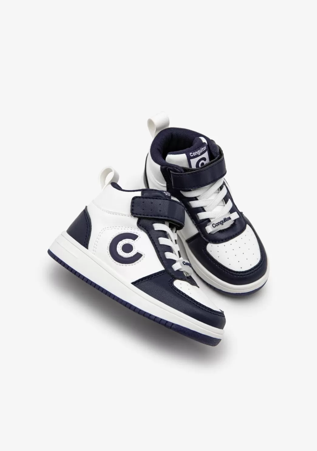 Zapatillas altas en color azul marino y blanco, con el logo de Conguitos en el lateral que se ilumina al caminar.