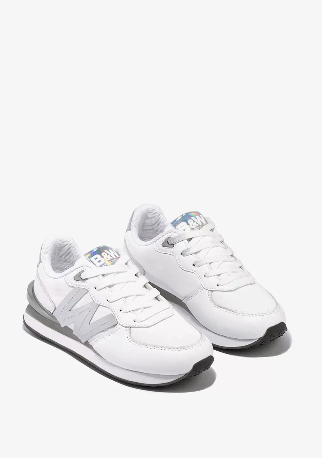 Sneakers de niña confeccionados en una combinación de materiales. Cordones de algodón ajustables. Parche iridiscente en talón y lengüeta. Logo plateado B&W en el lateral. Estas sneakers son un básico ideal para cualquier momento y look.