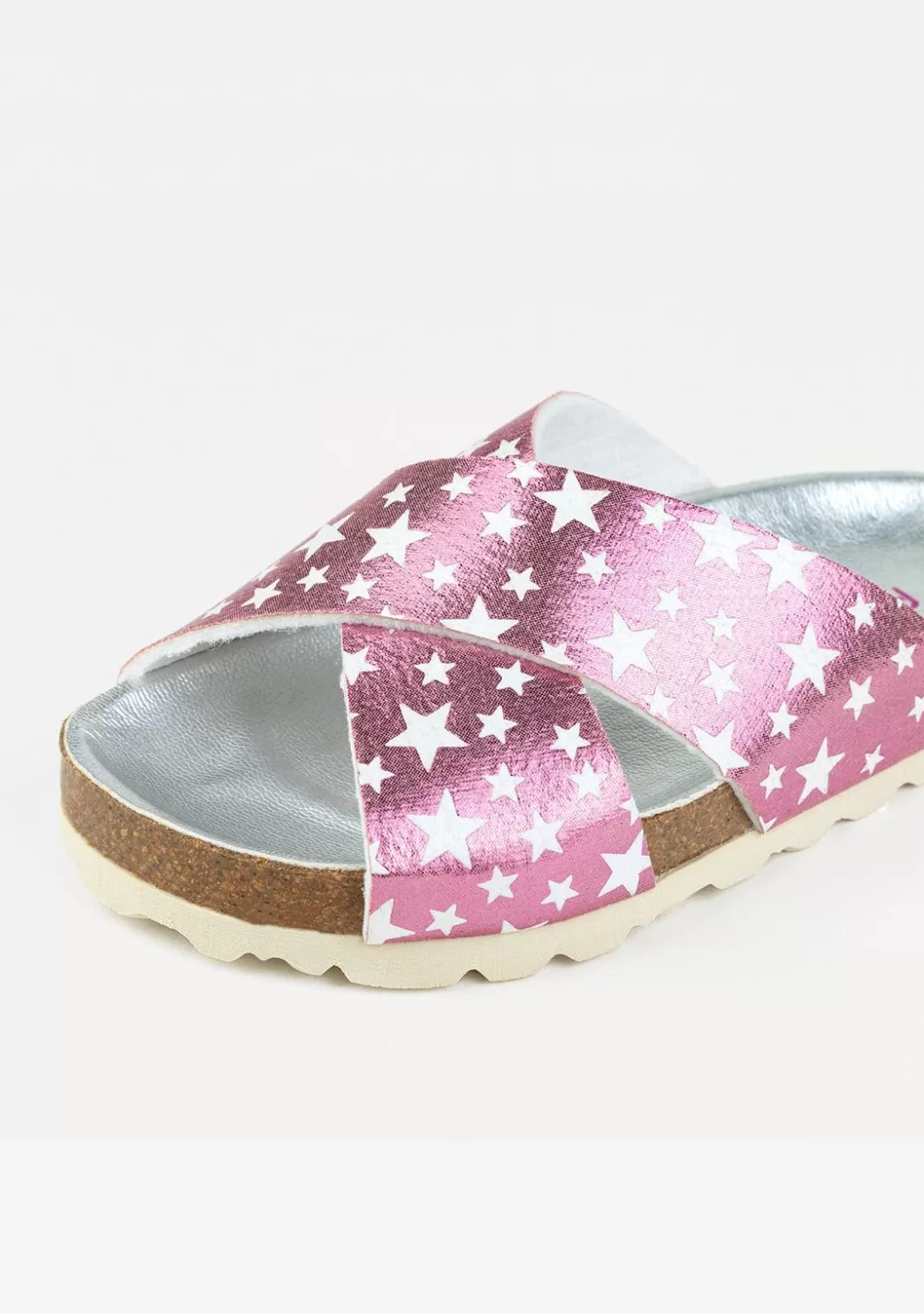 Sandalias de niña tipo bio de tiras cruzadas en color rosa metalizado y estampado de estrellas que brillan en la oscuridad. Ilumínalas con una luz artificial, apaga la luz y verás como brillan! Están fabricadas con un material sintético, con la planta al tono, resistente y ligero, y suela de goma que asegura una mayor protección y durabilidad.