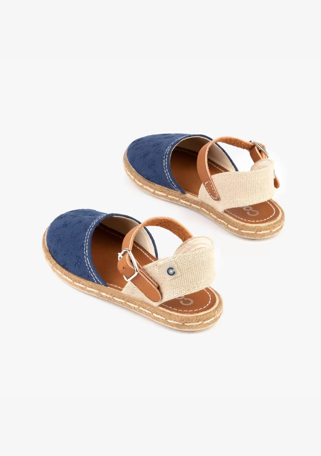Alpargatas valencianas infantiles de color azul marino fabricadas en tejido bordado batista, con suela de yute y cierre de pulsera con hebilla. La planta garantiza la transpirabilidad al pie y el piso es de goma, facilitando un gran confort. Unas sandalias cómodas e ideales para esta primavera-verano.