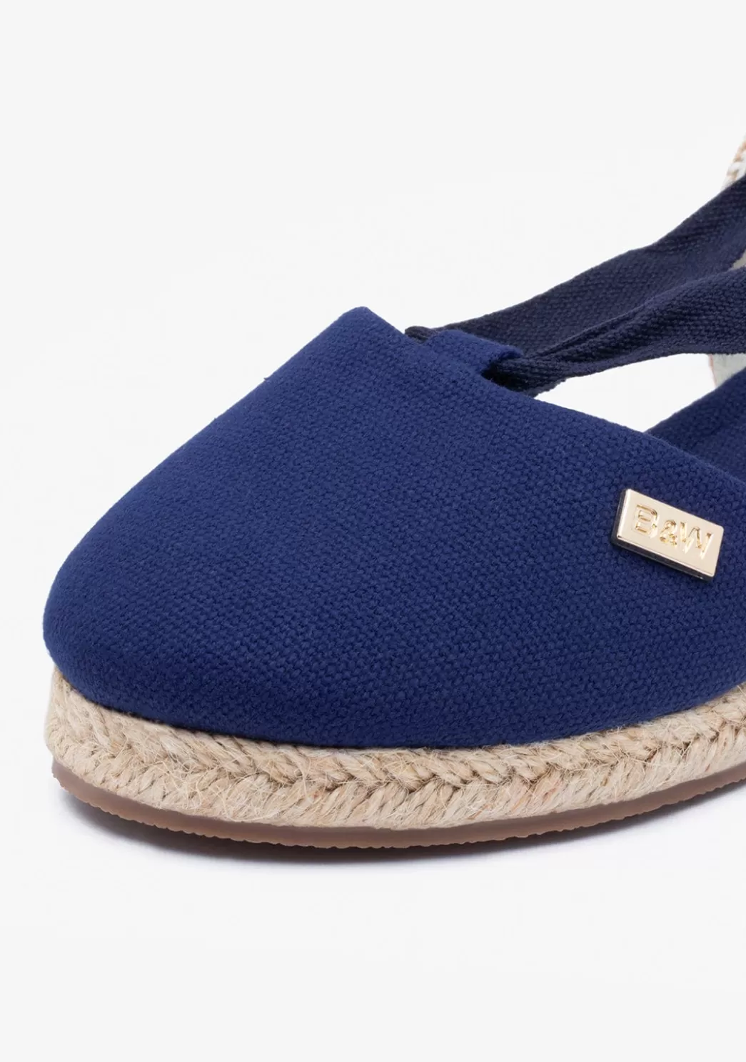 Alpargatas valencianas de niña con cuña de color azul marino fabricadas en lona con puntera cerrada, suela de yute y piso de goma. Disponen de cierre mediante cintas que unen desde la lona la zona trasera que se anuda en el tobillo mediante lazada. Unas sandalias con cuña para niña ideales para eventos y ocasiones especiales.