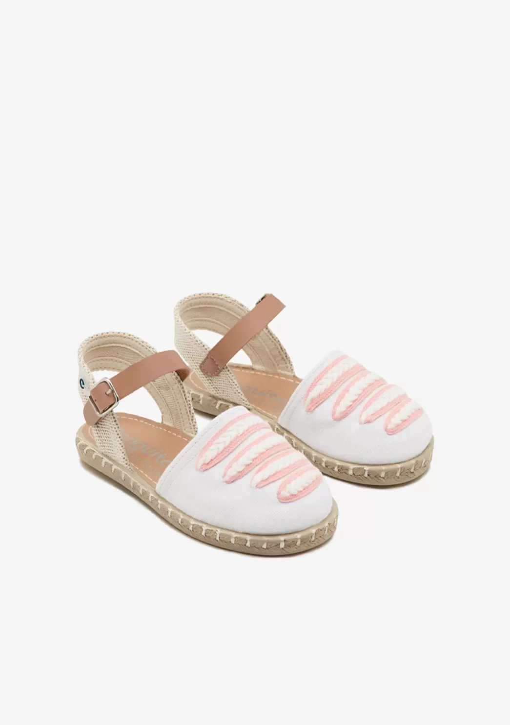 Alpargatas blancas con detalles en beige y rosa. Tiene la parte frontal cerrada y de tela blanca con tiras blancas y rosa. Su cierre es de pulsera marrón con hebilla para una mayor sujeción al pie.