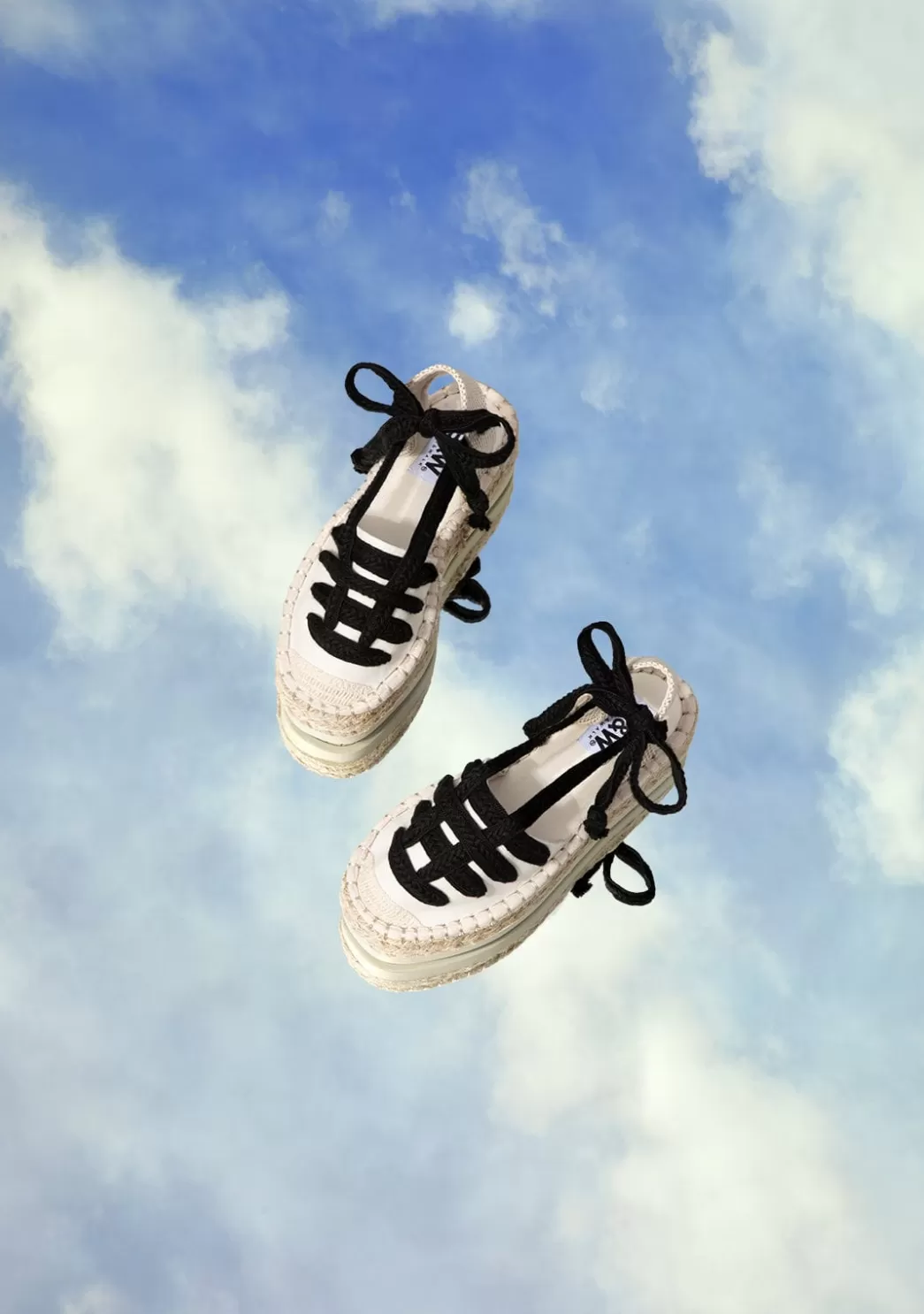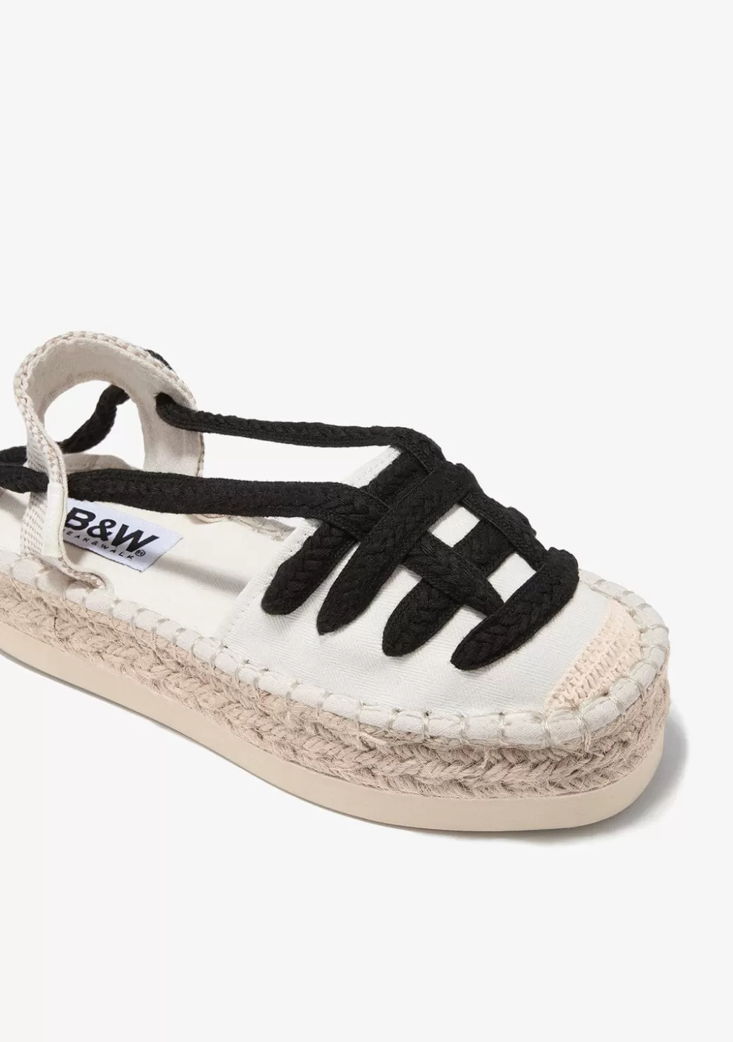Este modelo de alpargatas en color blanco roto están confeccionadas en lona. Tienen la puntera cerrada y de yute. Se atan a la pierna mediante cintas trenzadas que le dan un toque especial al calzado.