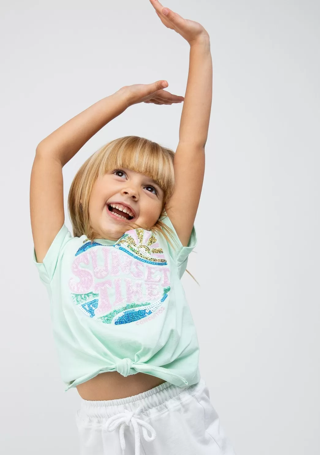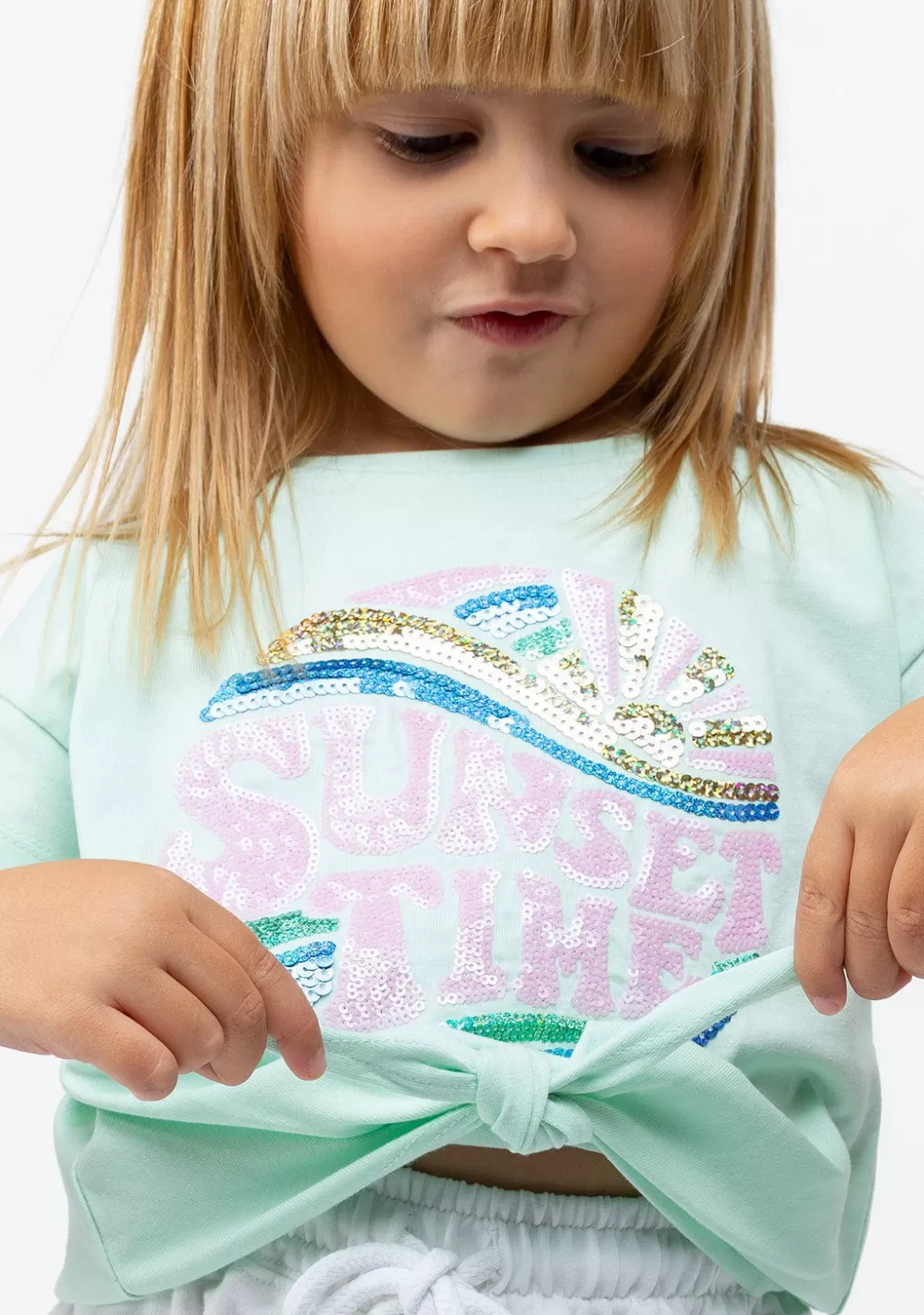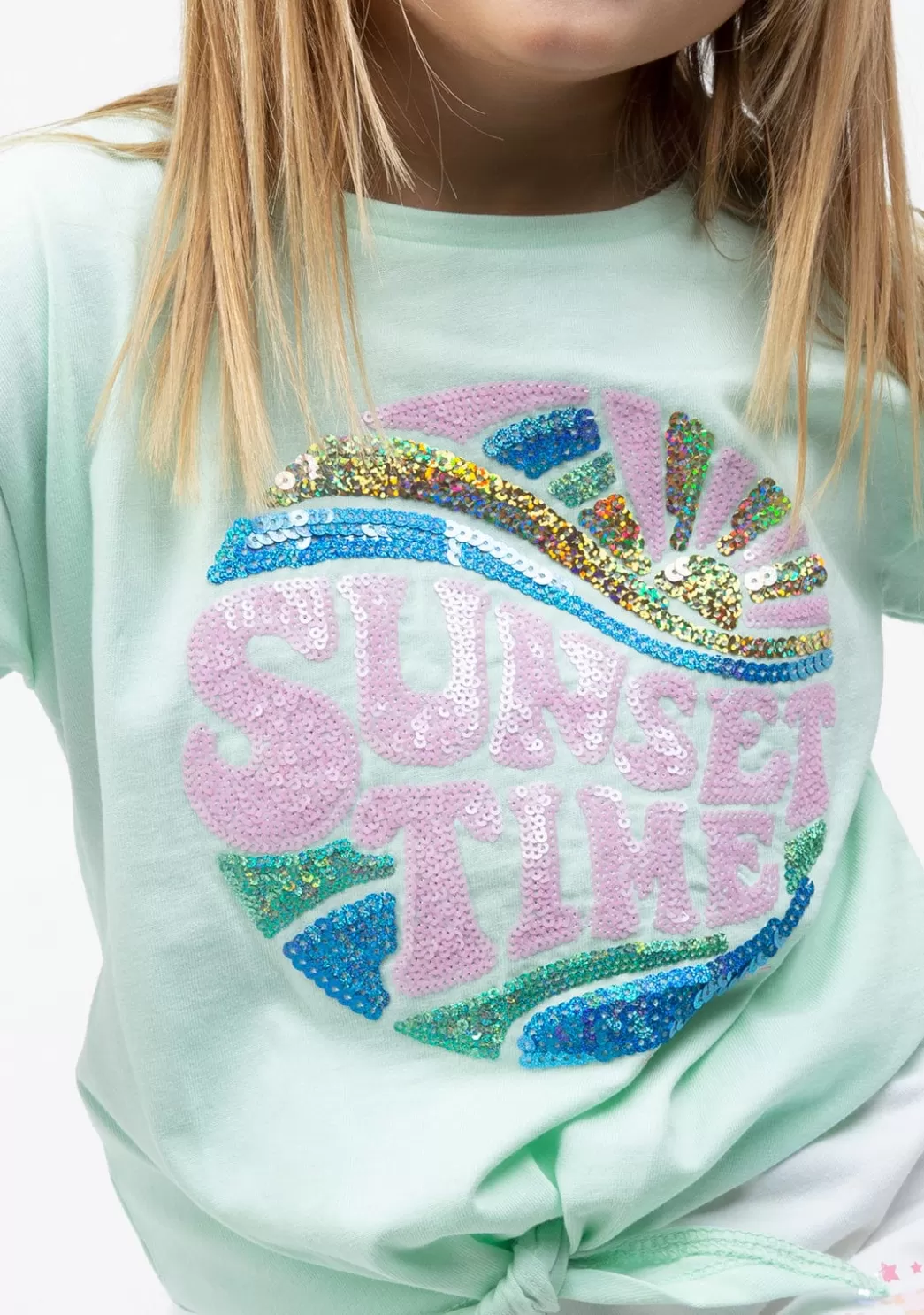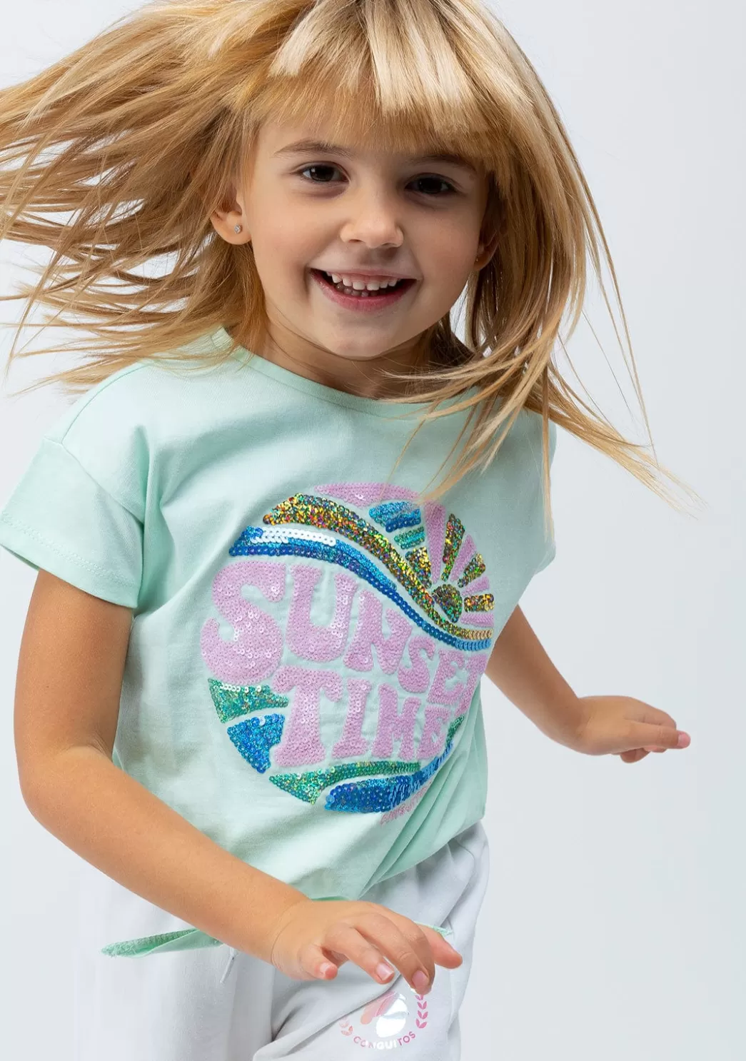 Camiseta de manga corta de niña en color menta. Cuenta con dibujo en el centro de la camiseta lleno de lentejuelas. Además, tiene el detalle de un nudo en la parte inferior. Una bonita camiseta con un diseño original ideal para este verano que es un imprescindible en el armario de tu hija.