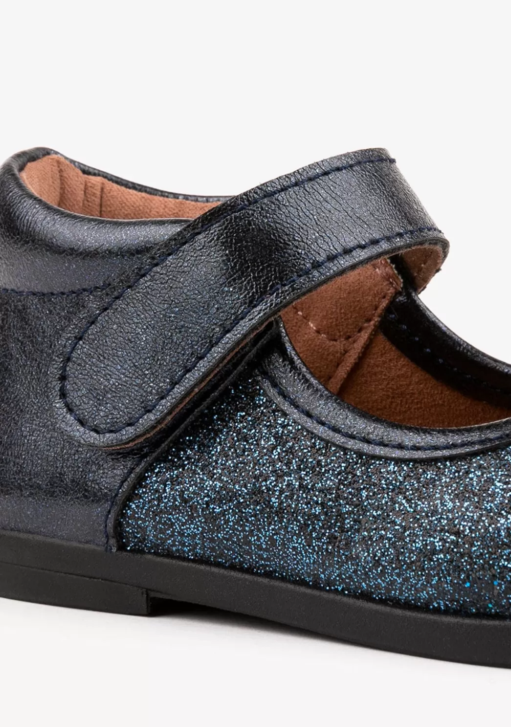 Zapatos Mary Janes de bebé fabricados en color azul marino metalizado y material glitter. Cuenta con un cierre de hebilla que da una mejor sujeción y ajuste en la zona del empeine. Su suela es de goma para garantizar la flexibilidad y el movimiento natural del pie. Calzado de bebé ideal para la temporada de otoño invierno. Fabricado en España.