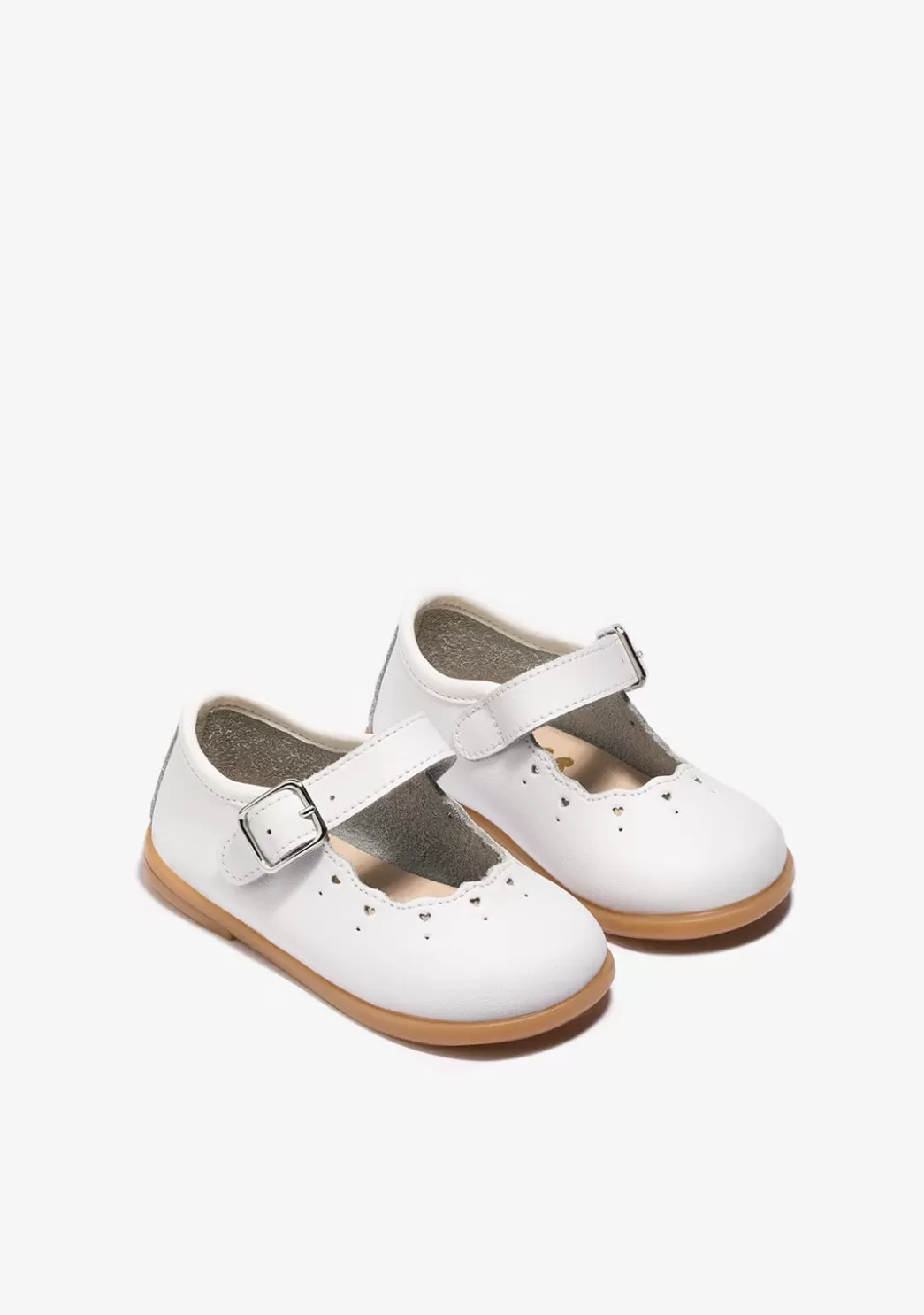 Este modelo de merceditas tiene hebilla metálica para mayor sujeción al pie. Cuenta con decoración con troquelado de corazones y círculos alrededor del borde. Están fabricadas en España.