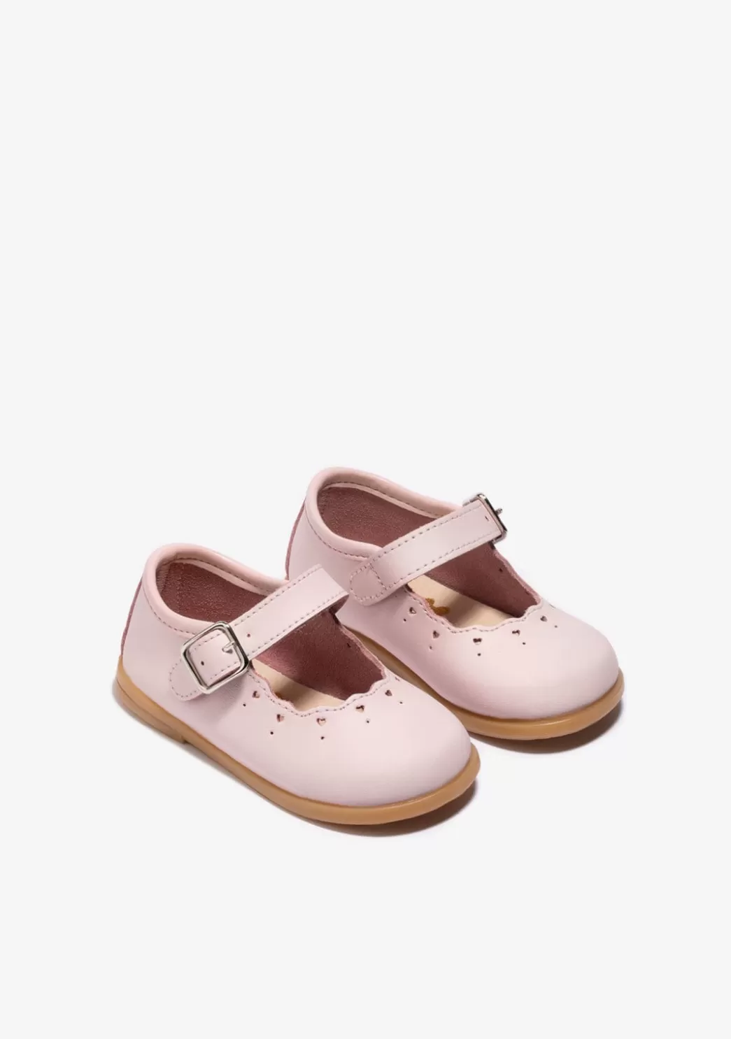 Este modelo de bailarinas tiene una hebilla metálica para mayor sujeción al pie. Cuenta con decoración con troquelado de corazones y círculos alrededor del borde. Están fabricadas en España.