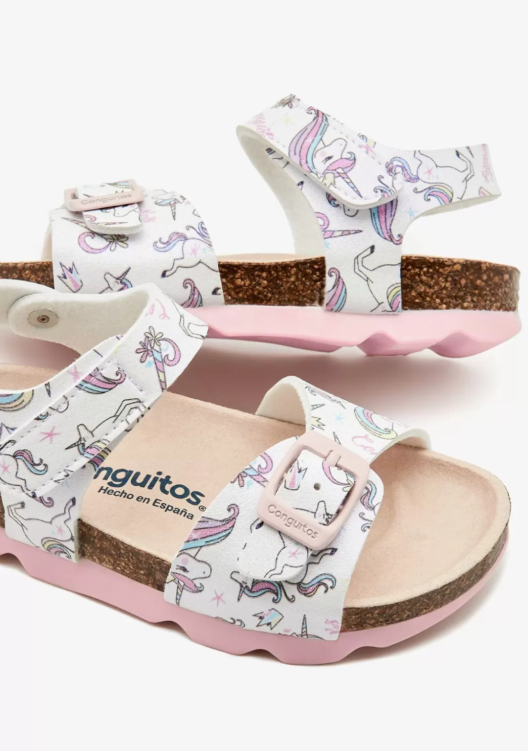 Este modelo de sandalias tiene una hebilla en la tira delantera y cuenta con cierre de tira adherente para mayor comodidad. Las sandalias son blancas, tienen estampados de unicornios y detalles en rosa.