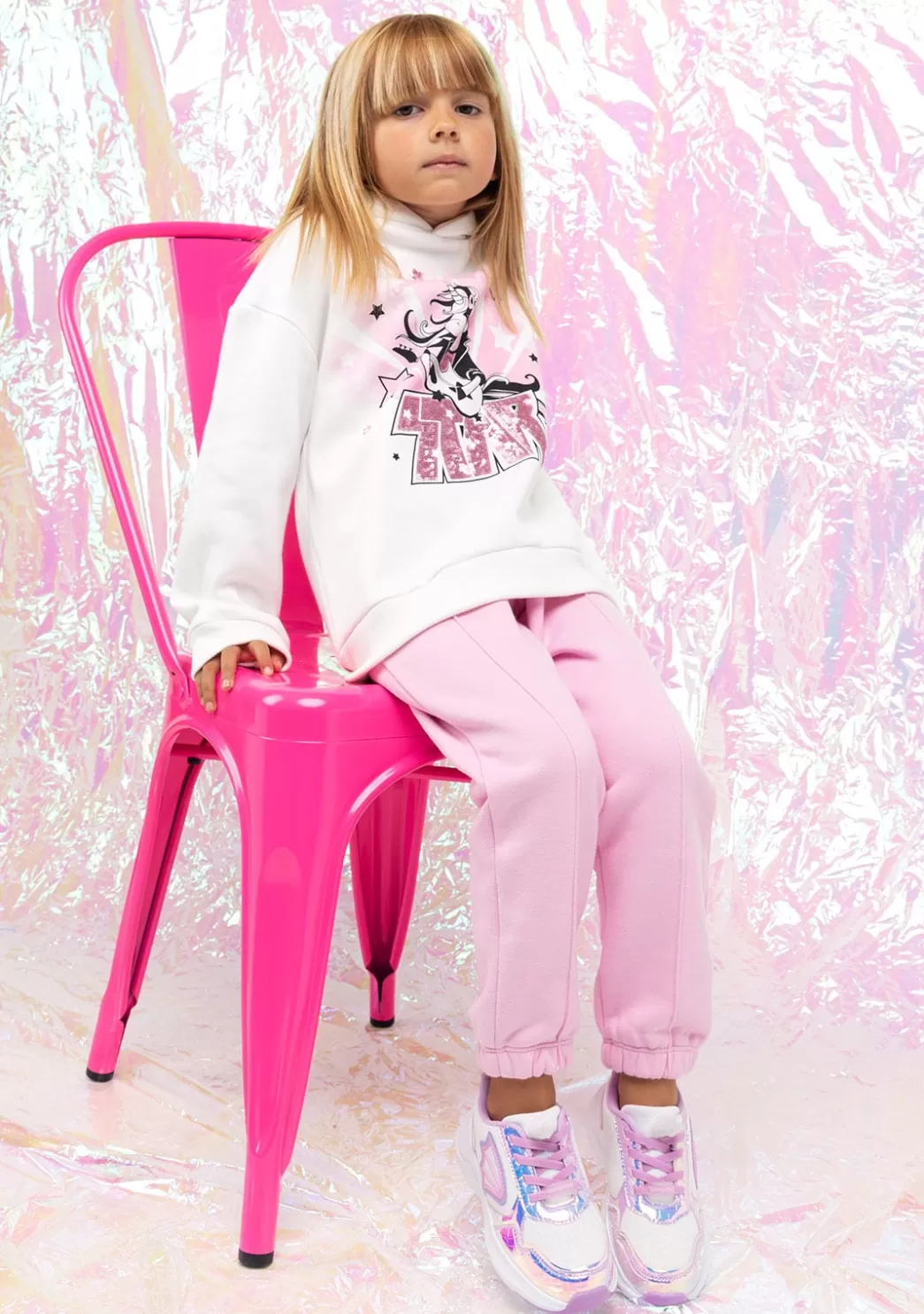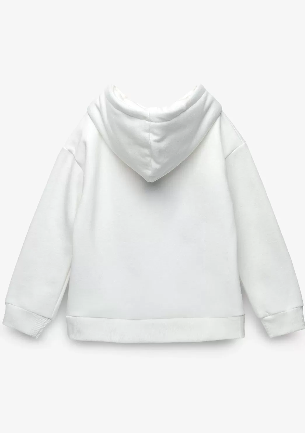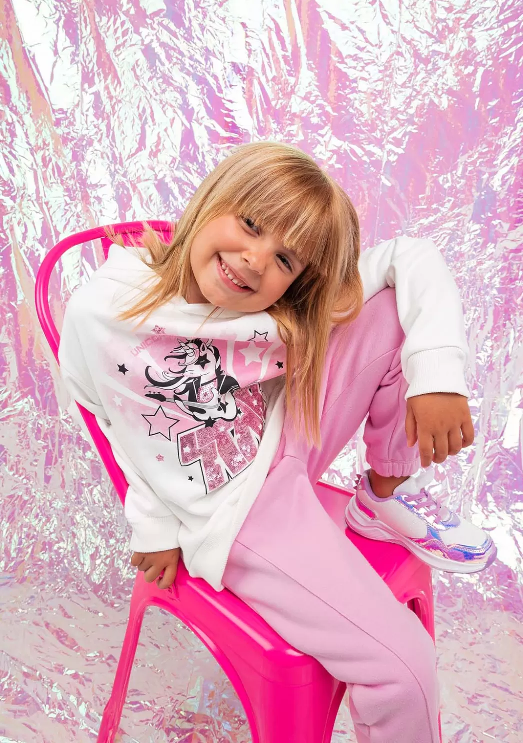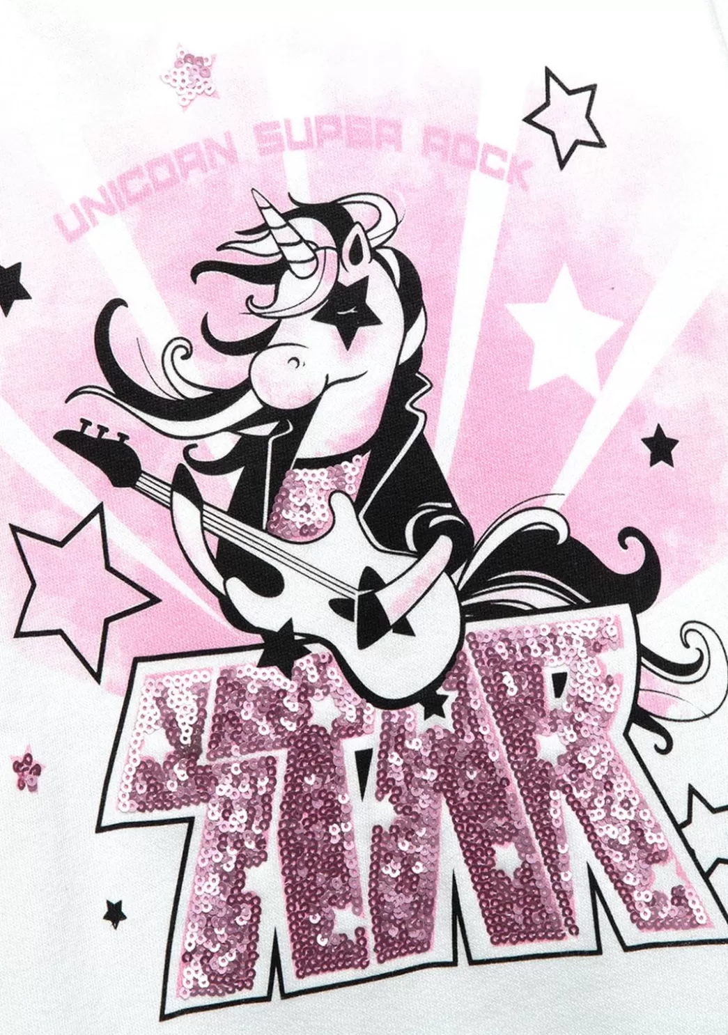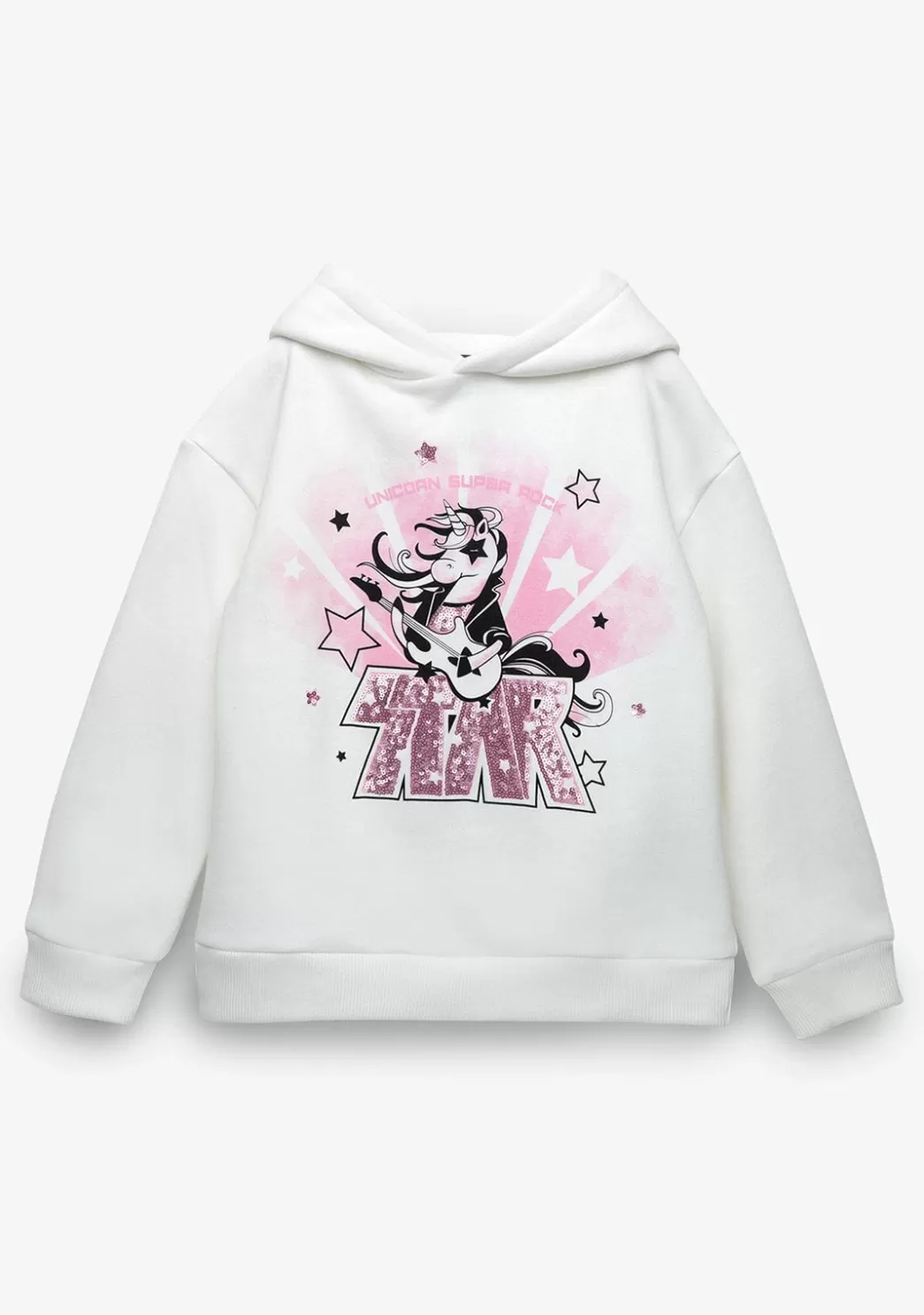 Sudadera de niña en color blanco con capucha confeccionada con materiales de algodón y diseño de unicornio rockero. Sus detalles en lentejuelas rosas hacen que el unicornio sea colorido y único. Esta sudadera tiene el interior afelpado y las mangas con acabado de puño para aislar mejor del frío.