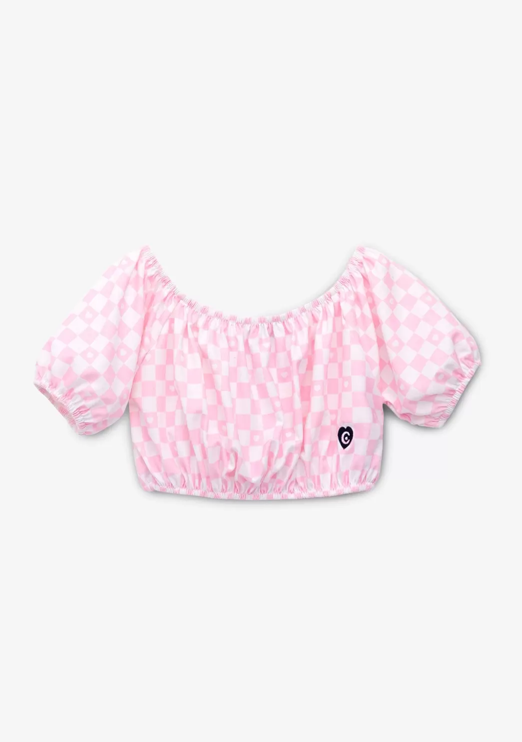 Nuevo top de manga corta en color rosa con estampado de cuadros. Tiene el detalle del logo de Conguitos en uno de los la…