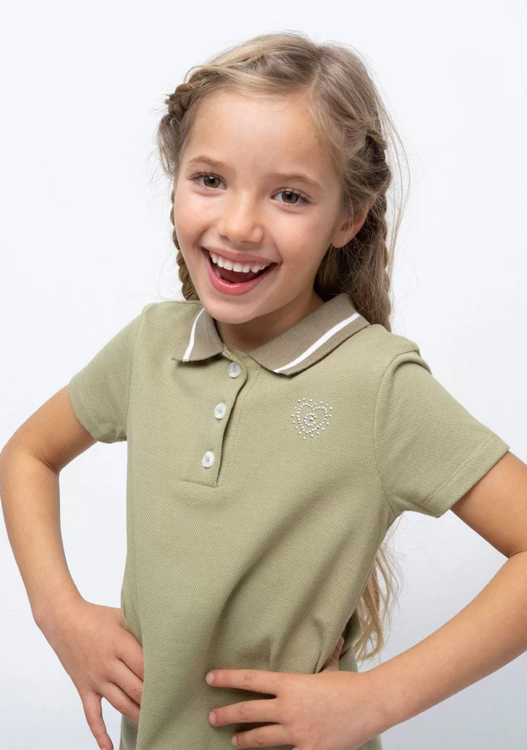 Vestido de algodón tipo polo en color verde kaki para niña con manga corta y cierre delantero de botones. Con detalle en el cuello que combina una línea blanca a la perfección con el rosa del vestido, además lleva el logo de Conguitos en strass. Un básico ideal para cualquier día. También disponible en rosa.