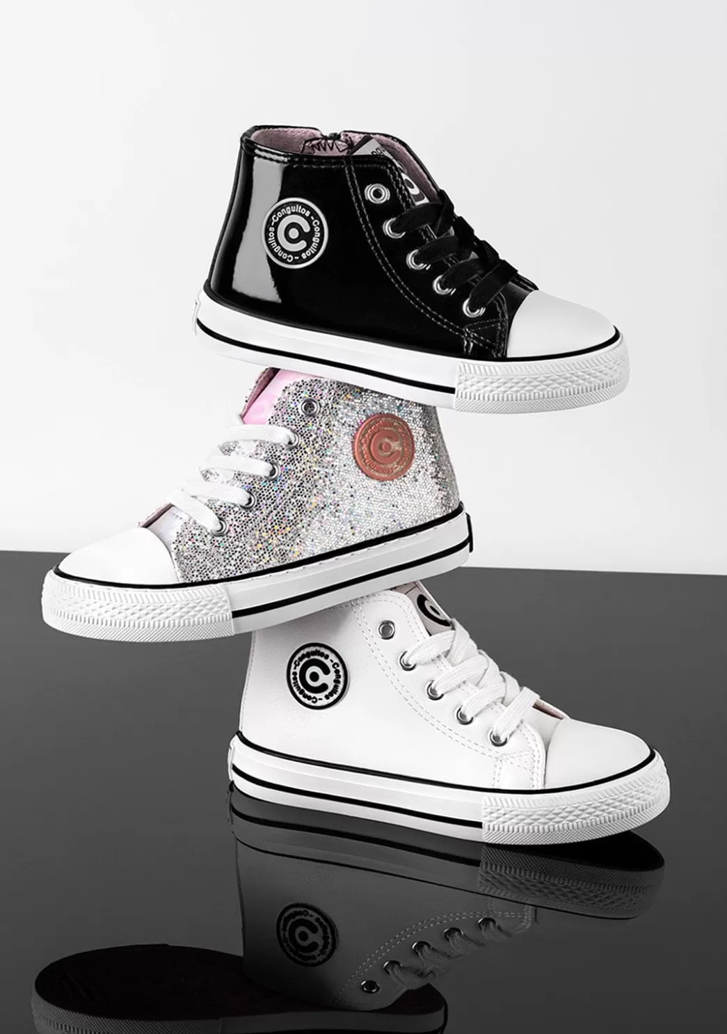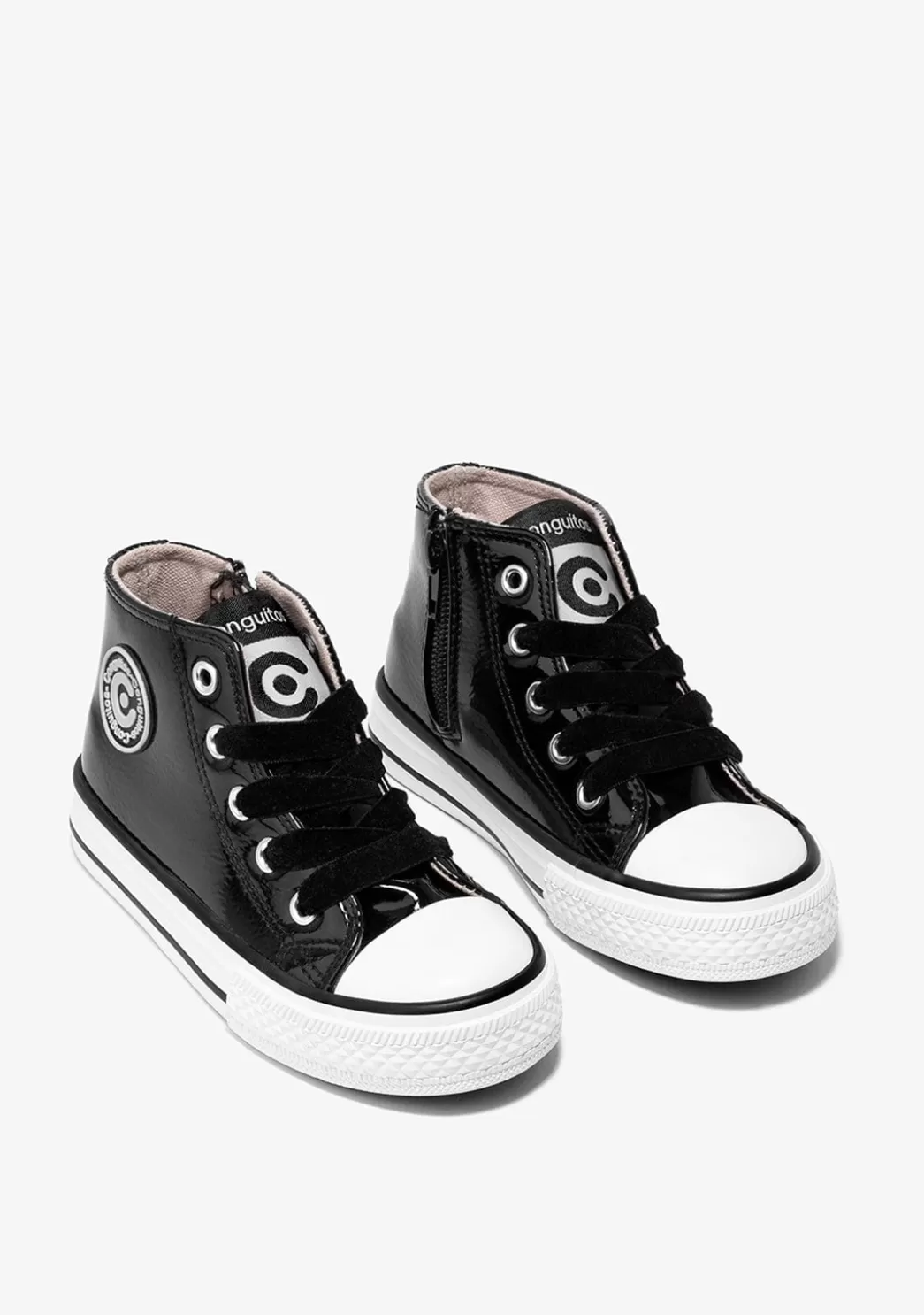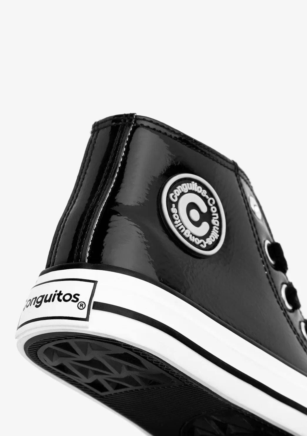 Sneakers altas confeccionadas en charol sintético. Cordones ajustables. Cremallera en el lateral interno para facilitar su puesta. Puntera reforzada y suela de goma. Logo de Conguitos en la parte externa de la zapatilla. Un básico para el día a día que no puede faltar en el armario de los más peques.