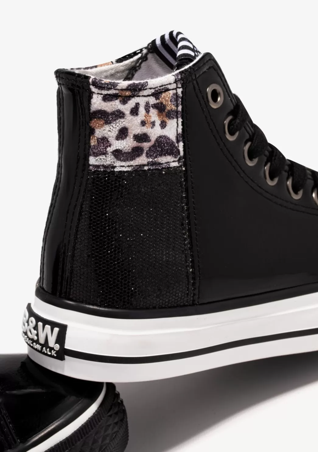 Zapatillas altas realizadas en una combinación de materiales con diferentes texturas como glitter y animal print que siguen las últimas tendencias. Cordones de algodón. Suela de goma con contraste en la puntera. Logo B&W en la parte trasera de la suela. ¡Lo más trendy!