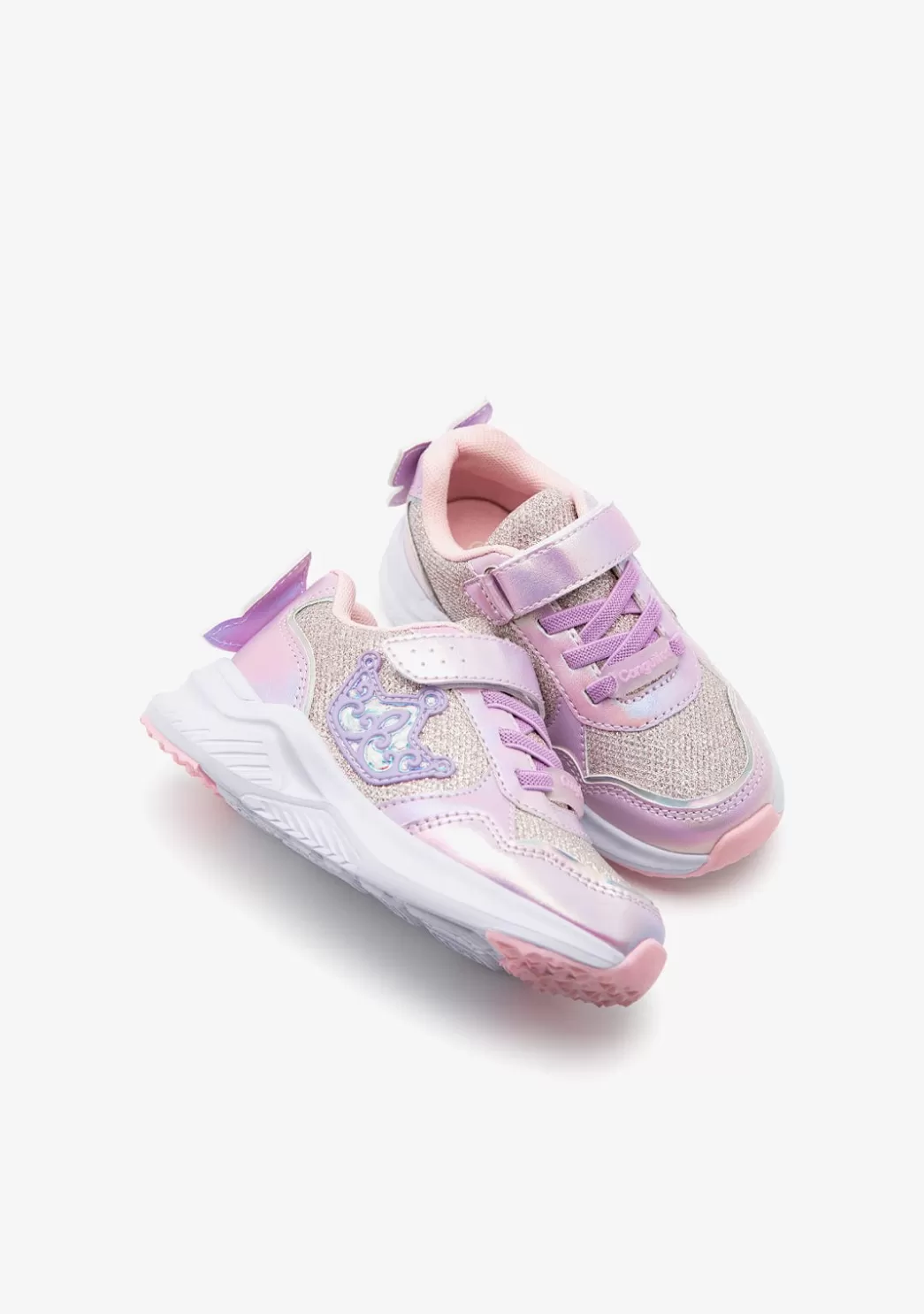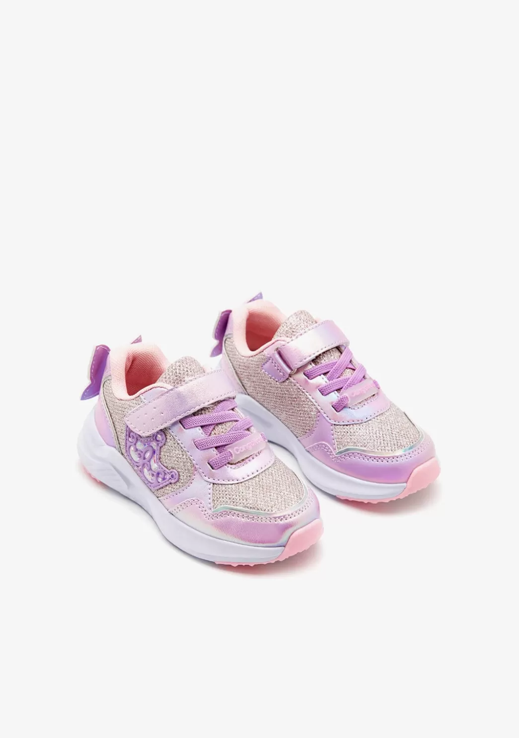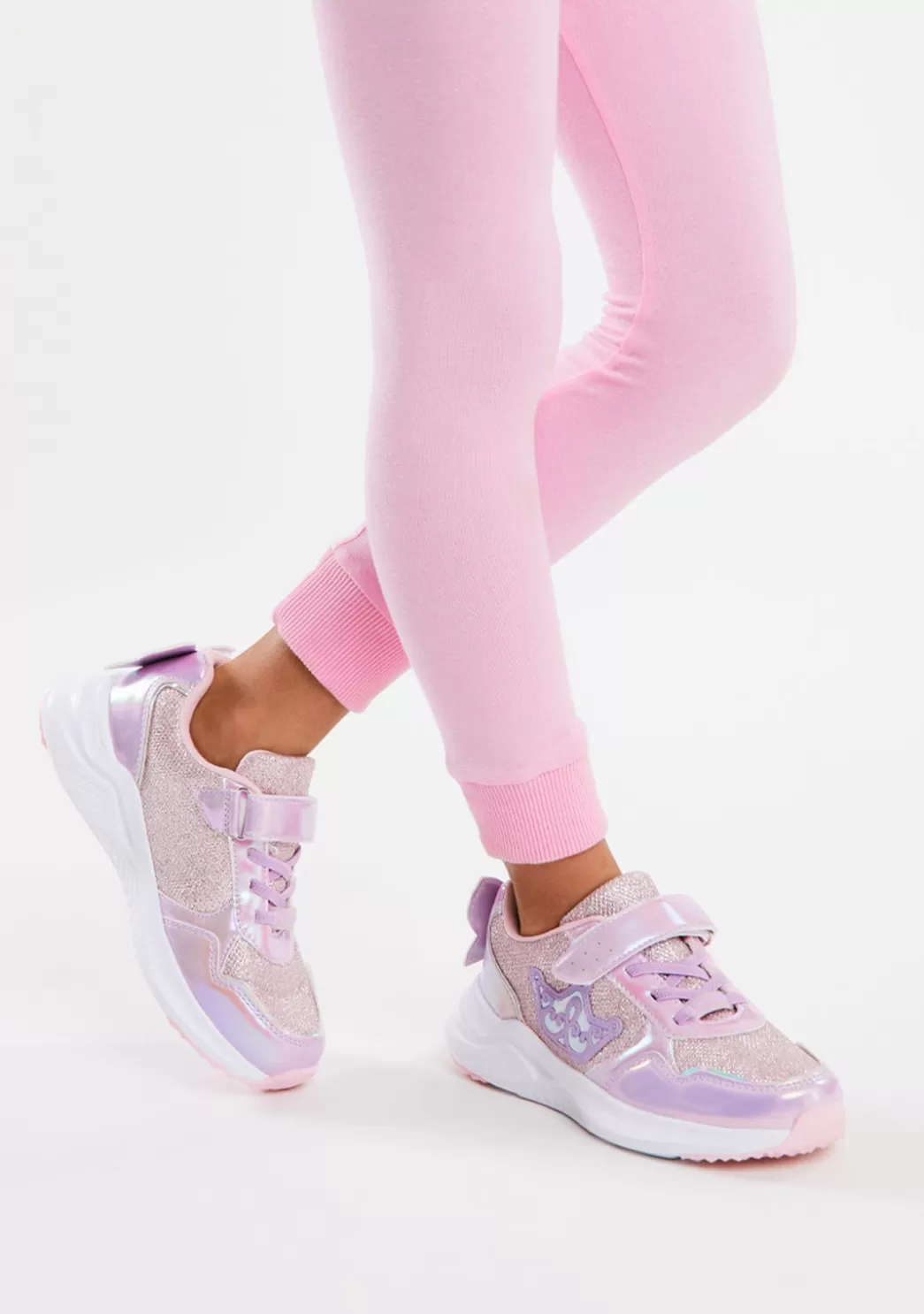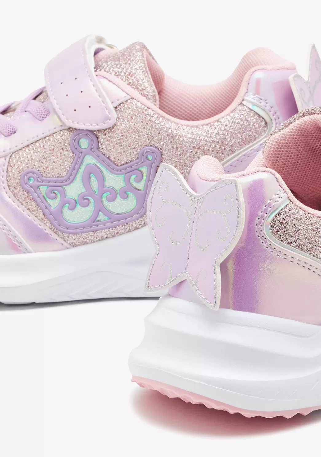 Deportivos con luces para complementar los estilismos más divertidos. Tiene detalles multicolor con purpurina, una mariposa en la parte trasera del zapato y luces en el lateral con forma de corona.