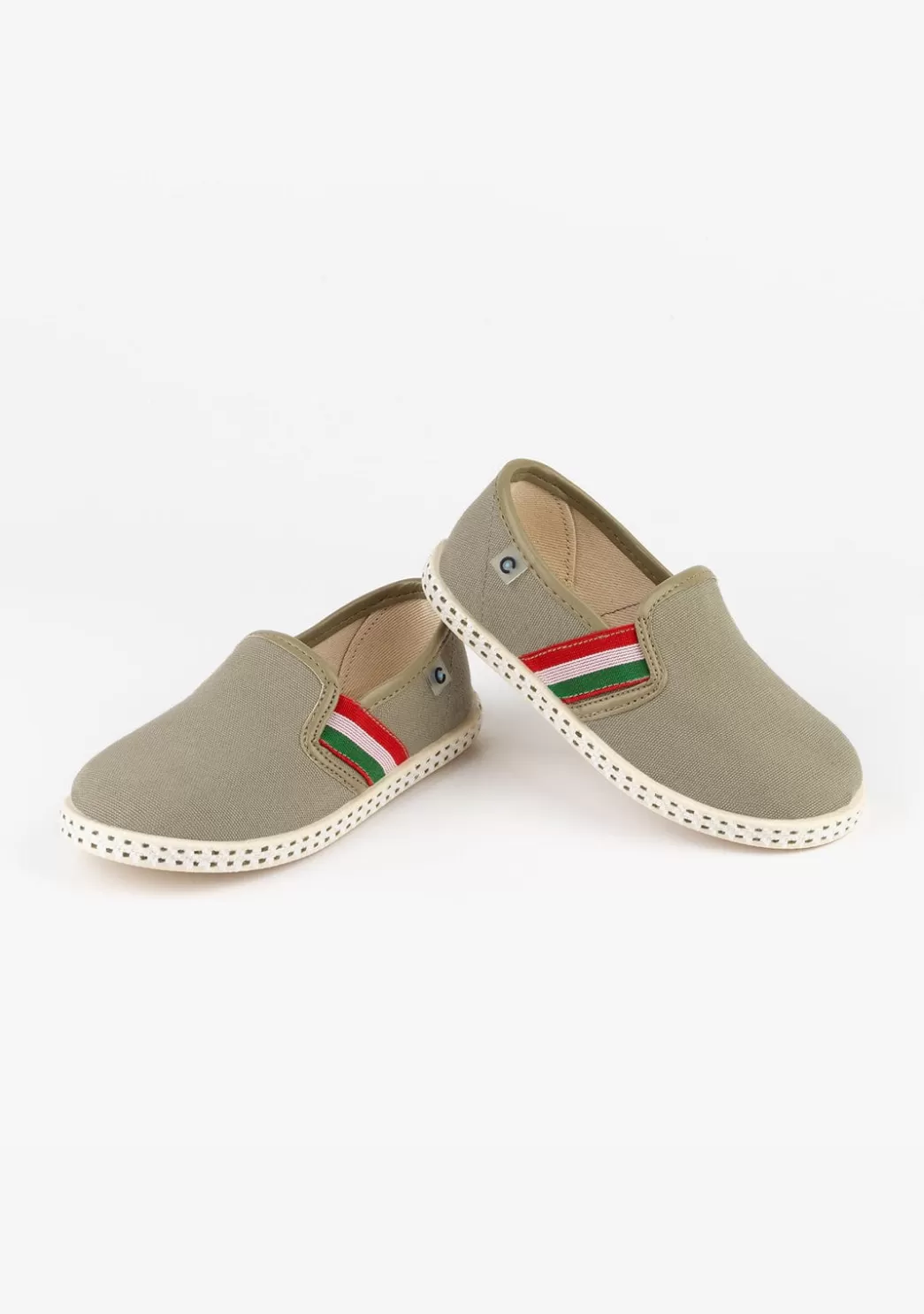 Zapatos de niño en color verde kaki con bandas laterales en rojo, blanco y verde, fabricados en tejido de lona y suela de estilo yute. Dispone de elásticos por los laterales en la zona del empeine para un mejor ajuste y comodidad a la hora de ponerlos. Una elección segura para llevar a tu pequeño a bodas, bautizos y comuniones con máxima comodidad y estilo.