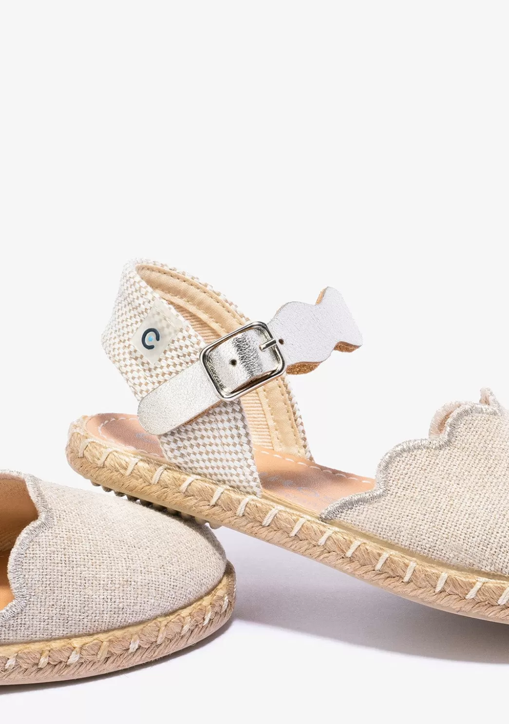Alpargatas de niña en color plata con acabado metalizado. Suela de yute y exterior de goma. Cierre de pulsera con cierre de hebilla. Perfil del empeine y tira de cierre con acabado en ondas.