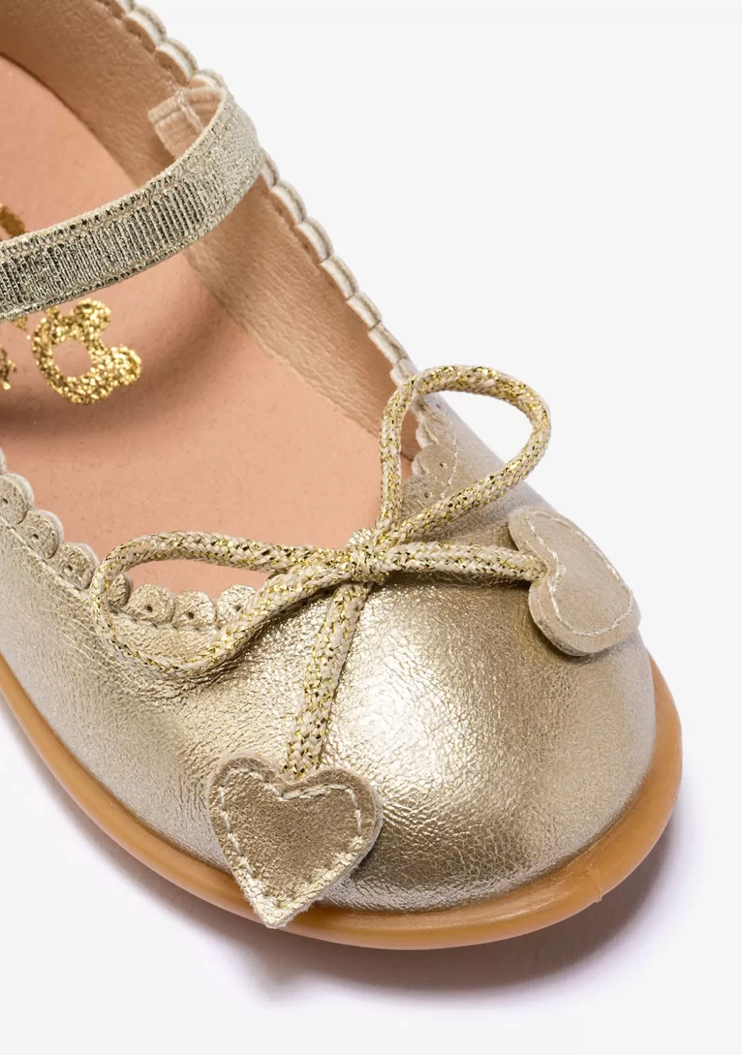 Bailarinas de niña con detalle de ondas. Realizadas en material metalizado. Tira elástica en el empeine para una mejor sujeción del pie. Cordón delantero fijo. Suela de goma que aporta comodidad, a la vez que se convierte en un calzado ideal para cualquier ocasión o evento.