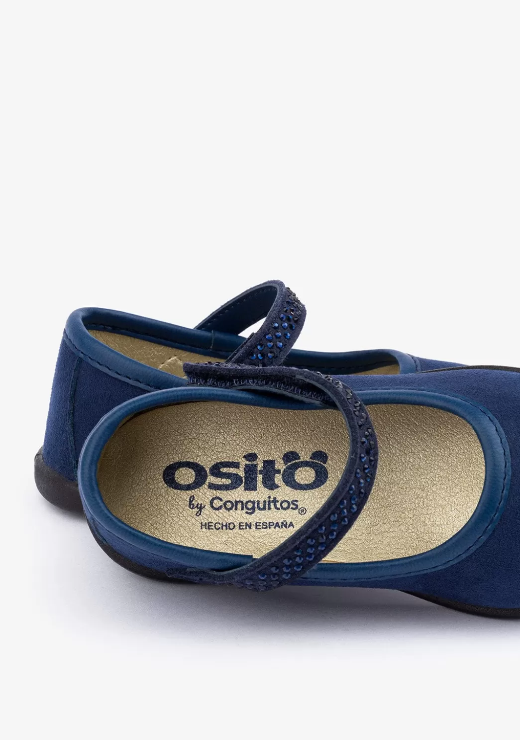 Bailarinas de bebé fabricadas en material de ante sintético con pedrería y banda para una mejor sujeción. Estos zapatos planos tienen una suela de goma para el máximo confort de la niña. Las bailarinas perfectas para tu niña.