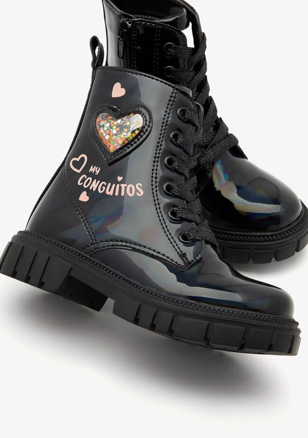 Botas de acabado negro y detalle de corazones Conguitos. Una pieza perfecta para cualquier estilismo.