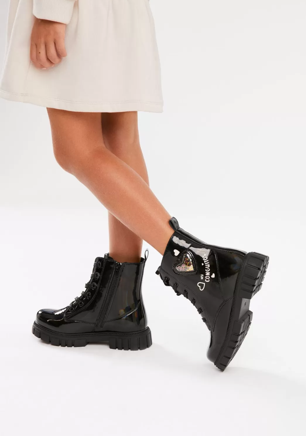 Este diseño en tono oscuro está confeccionado con materiales sintéticos de alta calidad con acabado brillante. Cuenta con un cierre de lazada que permite un ajuste perfecto. Además, también presenta cremallera interior y un diseño de corazones a contraste con acabado glitter en la parte lateral.