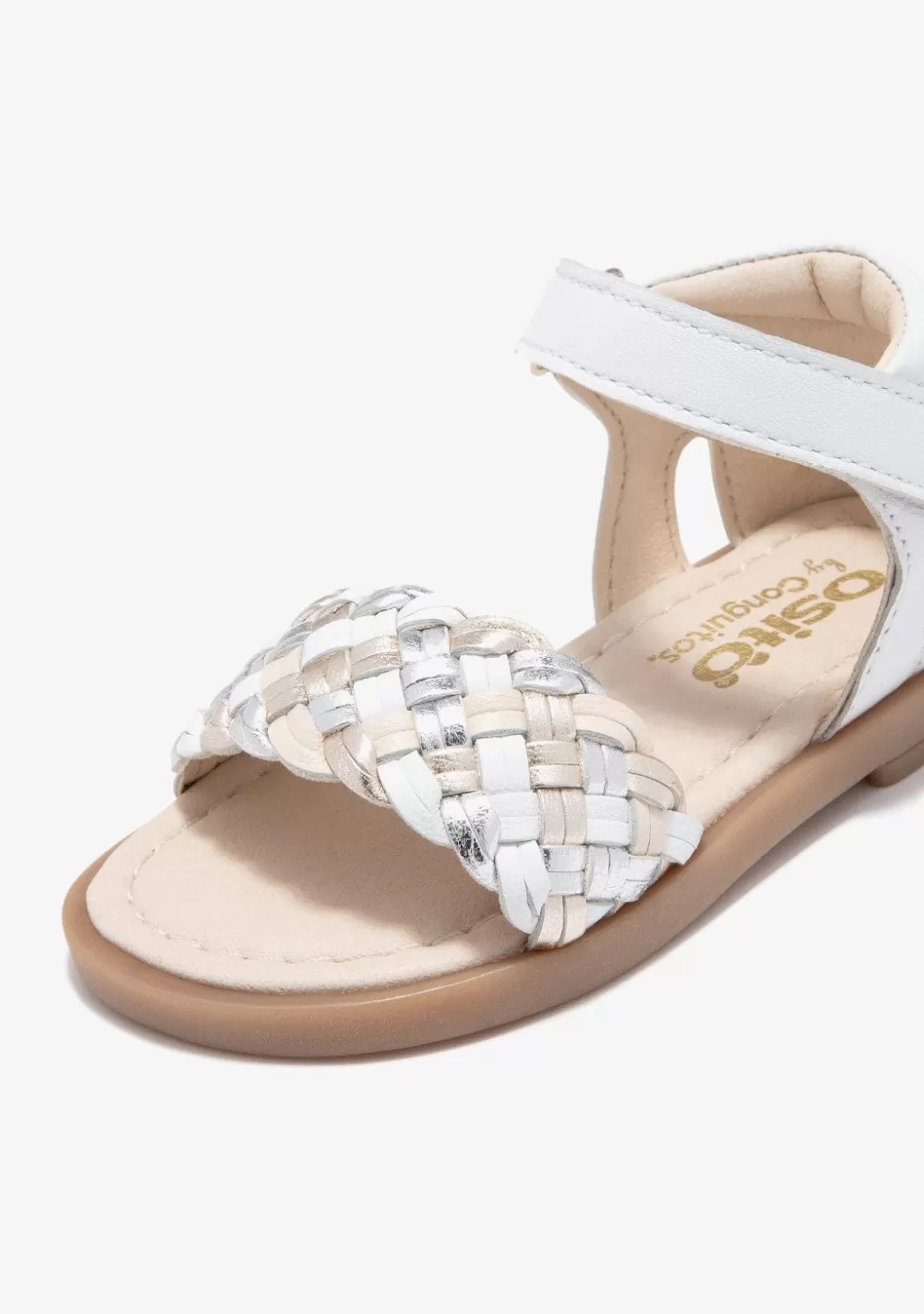 Este modelo en blanco está diseñado en piel blanca. Tiene cierre de tira adherente para mayor comodidad. La cinta delantera es un trenzado de material en oro, plata y blanco.