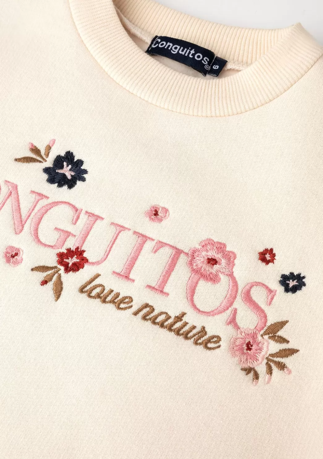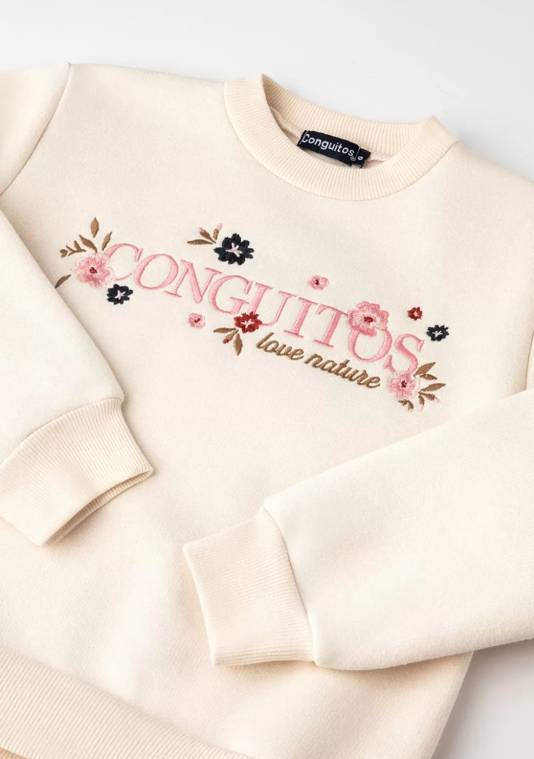 Sudadera confeccionada en algodón con cálido interior afelpado. Cuello, puños y bajo en canalé. Bordado central con motivos florales. Perfecta para todos los looks casual.