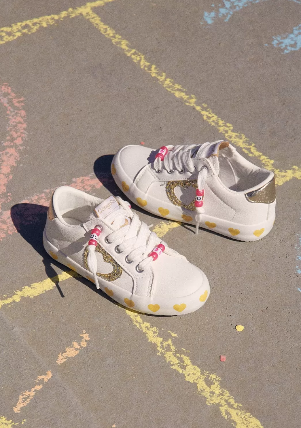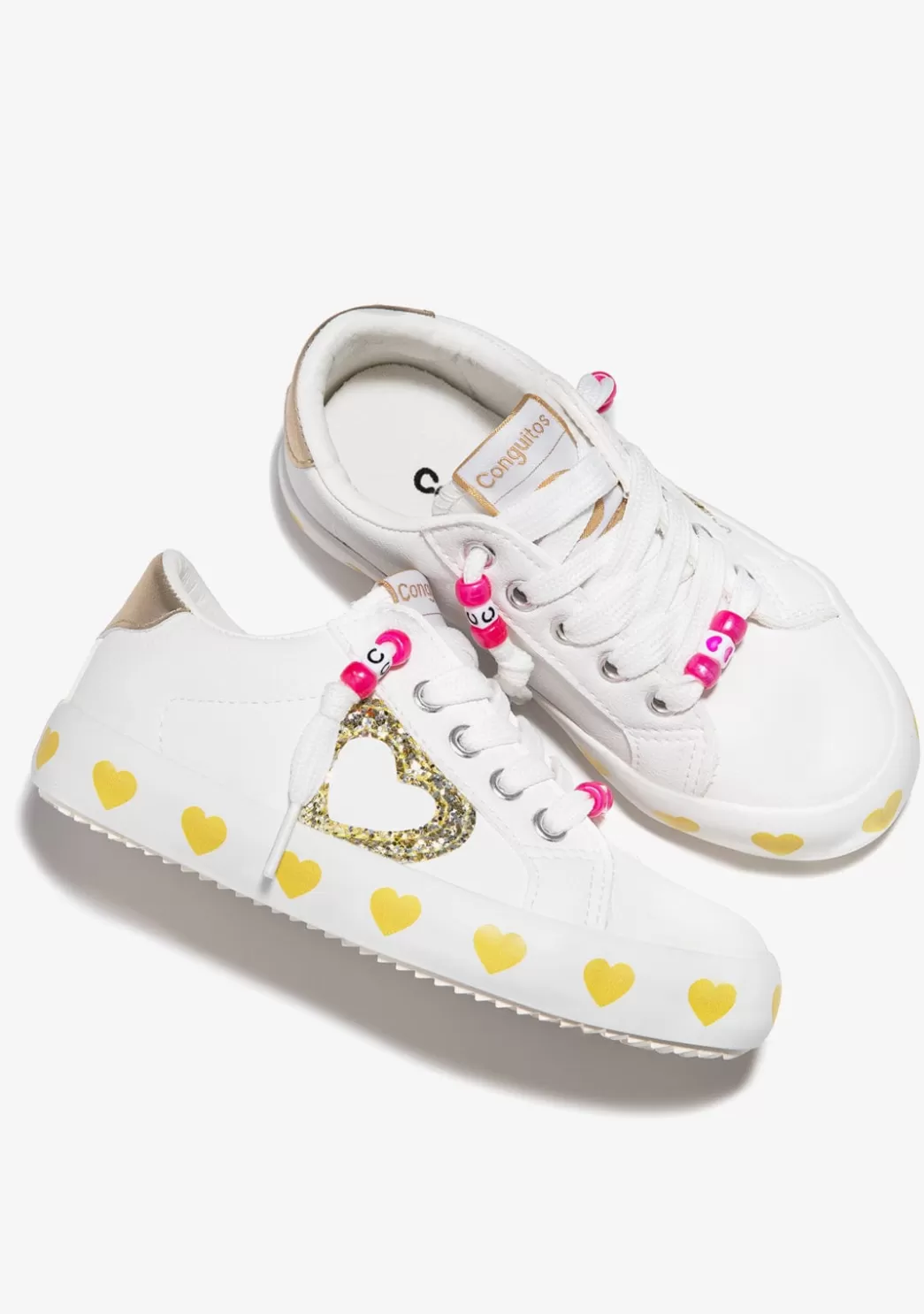 Este modelo combina la micronapa blanca con glitter dorado. Los deportivos están decorados con un corazón de glitter en el lateral y alrededor de la suela. Tienen elástico interior fácil de poner y quitar. No necesitan atarse.