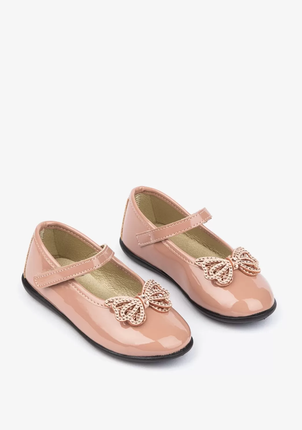 Bailarinas de niña en color rosa con materiales sintéticos y acabado de charol. Dispone de una cinta en el empeine que garantiza la sujeción del píe y un lazo de pedrería como detalle. Con suela de goma para garantizar la flexibilidad y la comodidad de cada pisada.