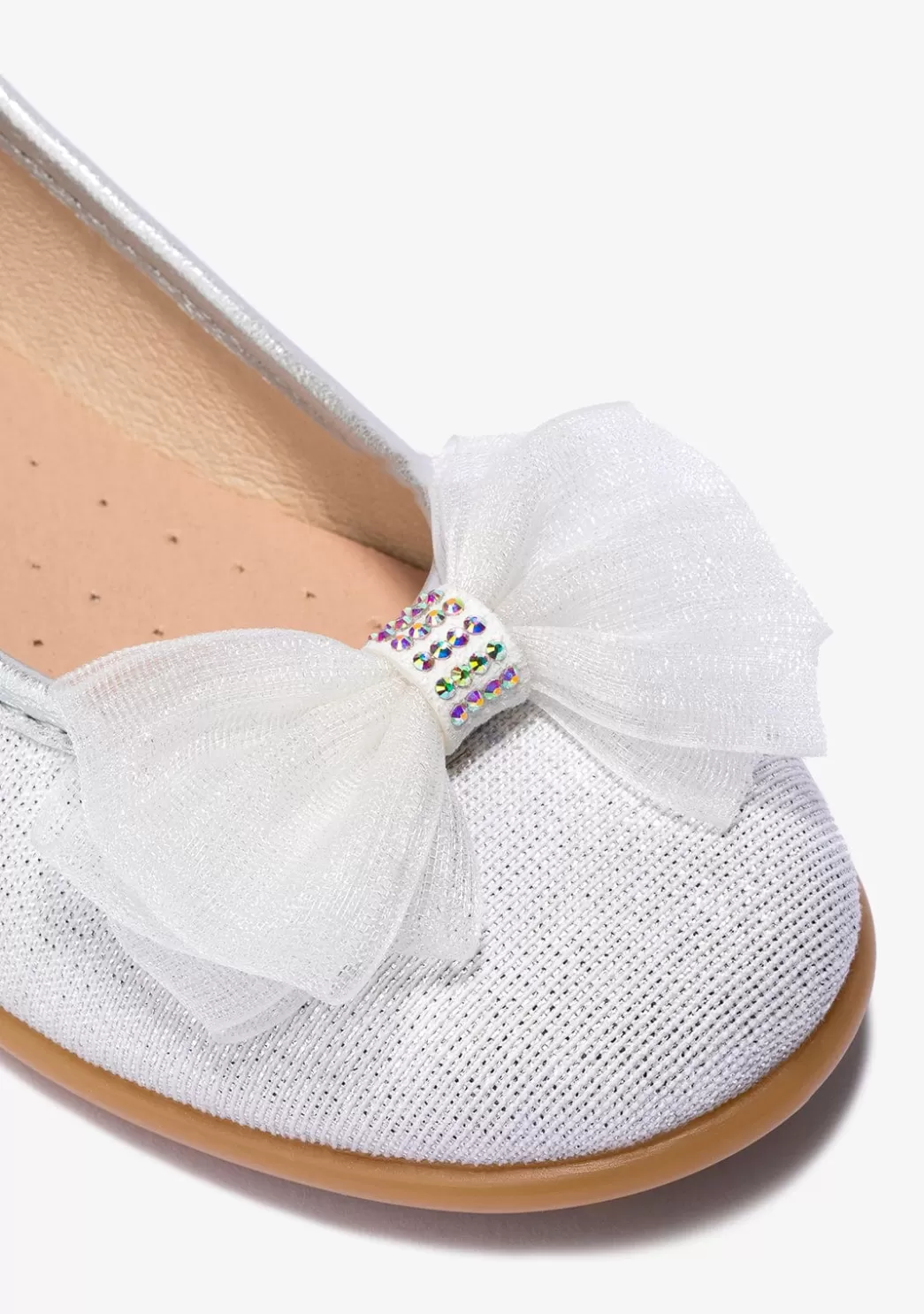Bailarinas de material sintético metalizado. Lazo decorativo de tul en la parte delantera. Suela de goma para mayor comodidad y confort. Estas bailarinas son el calzado ideal para cualquier ocasión o evento.