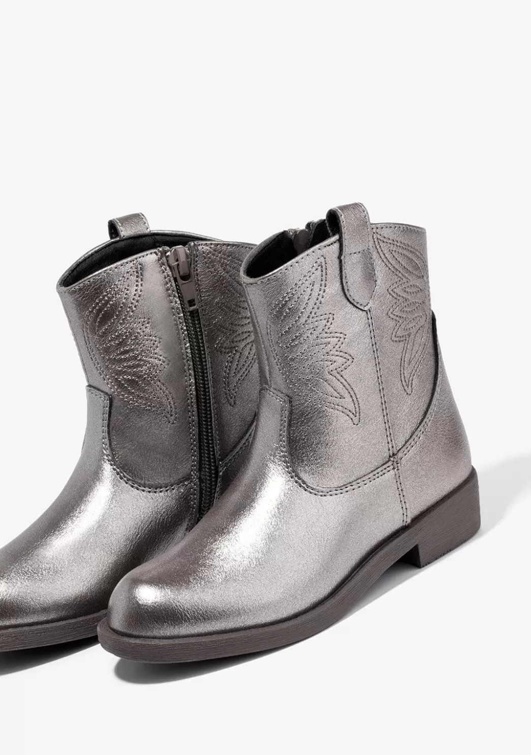 Este modelo en color gris está decorado con bordados alrededor de la caña. Cuenta con cremallera en la cara interna y tiradores para que sean más fáciles de poner y quitar. Además, tiene suela de goma para un mejor agarre al suelo.