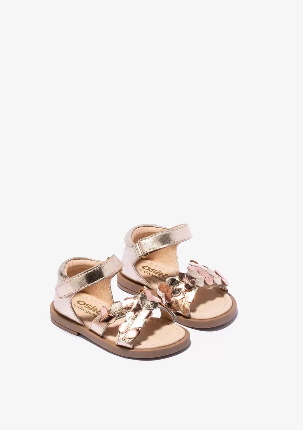 Sandalias de bebé confeccionadas en napa metalizada con adornos de corazón en las tiras delanteras. Cuentan con un cierre de tira adherente ajustable con pulsera que se ajusta al tobillo y garantiza una sujeción total del pie. Además, tienen suela de goma, lo que las convierte en unas sandalias cómodas, flexibles y de calidad.