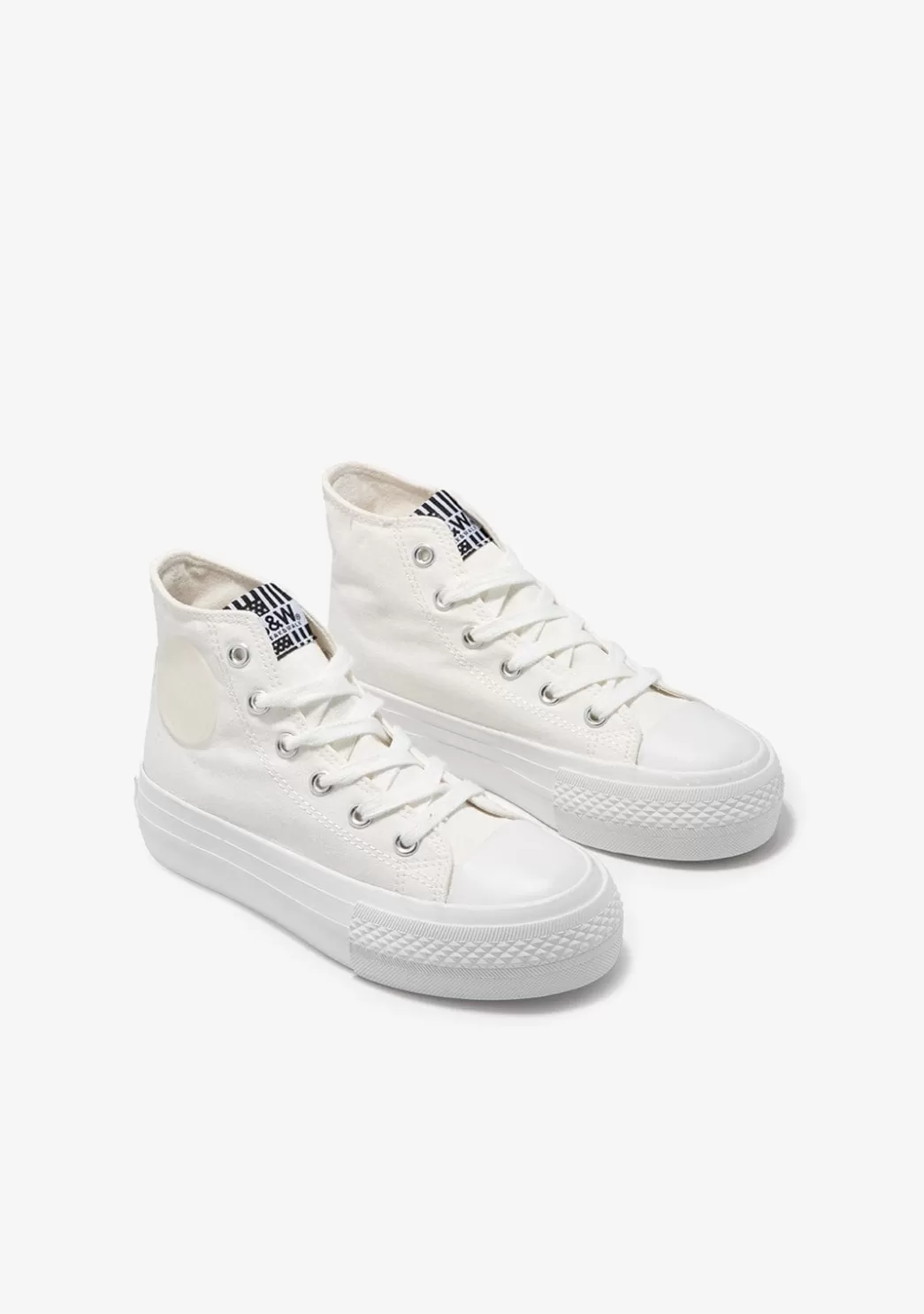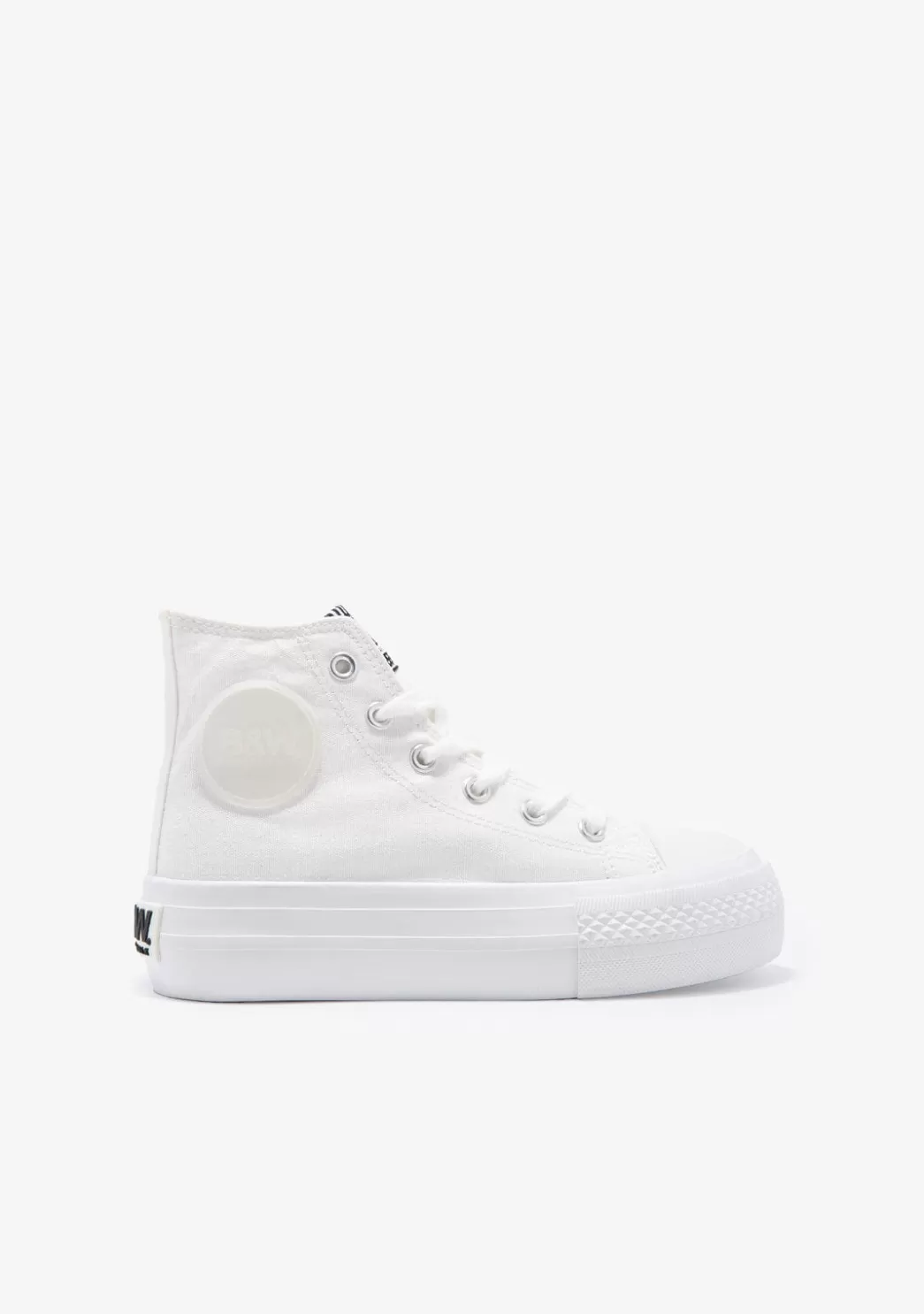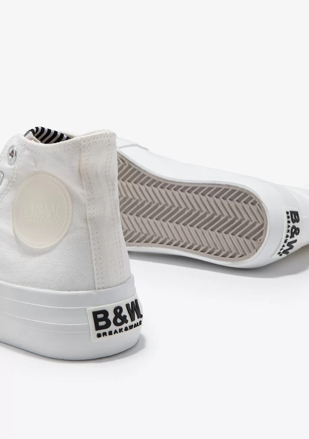 Este modelo combina la lona negra con pespuntes en blanco a juego con los cordones. Tiene refuerzo de goma en la puntera. Están decoradas con el emblema de B&W en goma en la caña y en el talón.