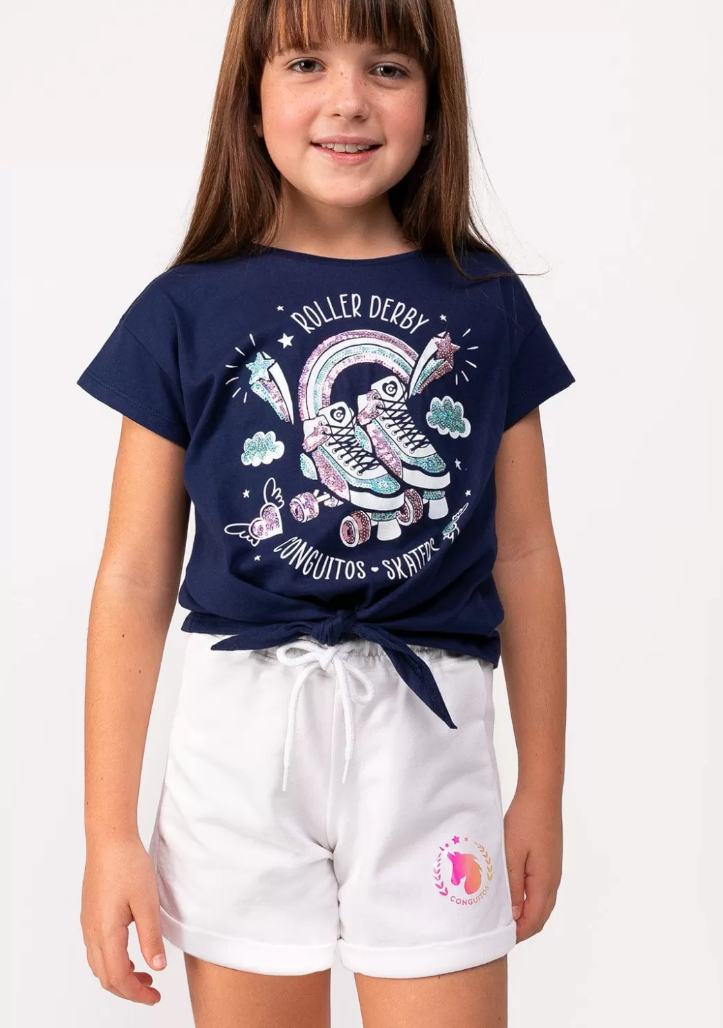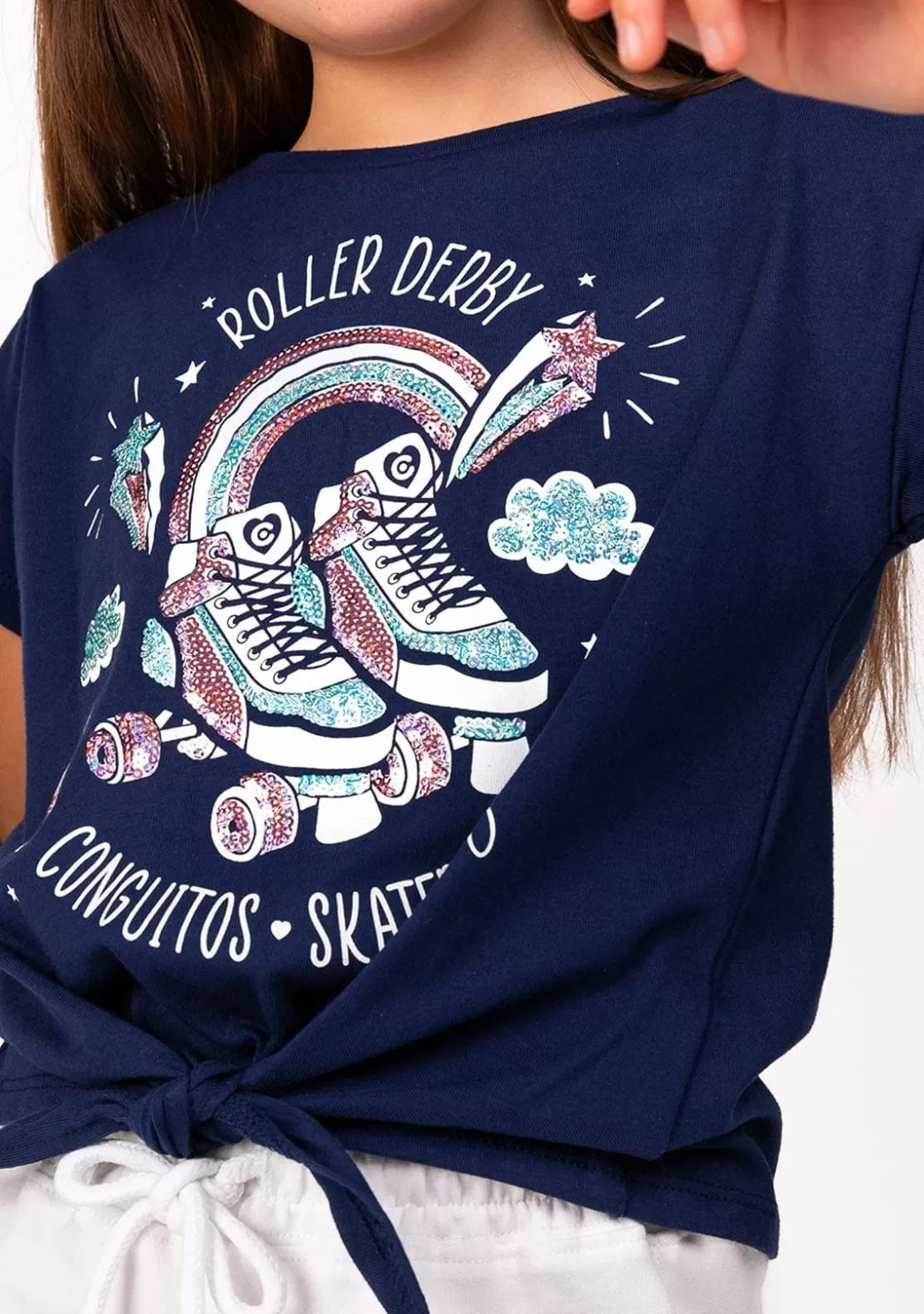 Camiseta de manga corta para niña en color azul marino. Tiene el detalle de un dibujo de patines con lentejuelas en tonos azules y rosas. Una bonita camiseta con un diseño original ideal para este verano que es un imprescindible en el armario.