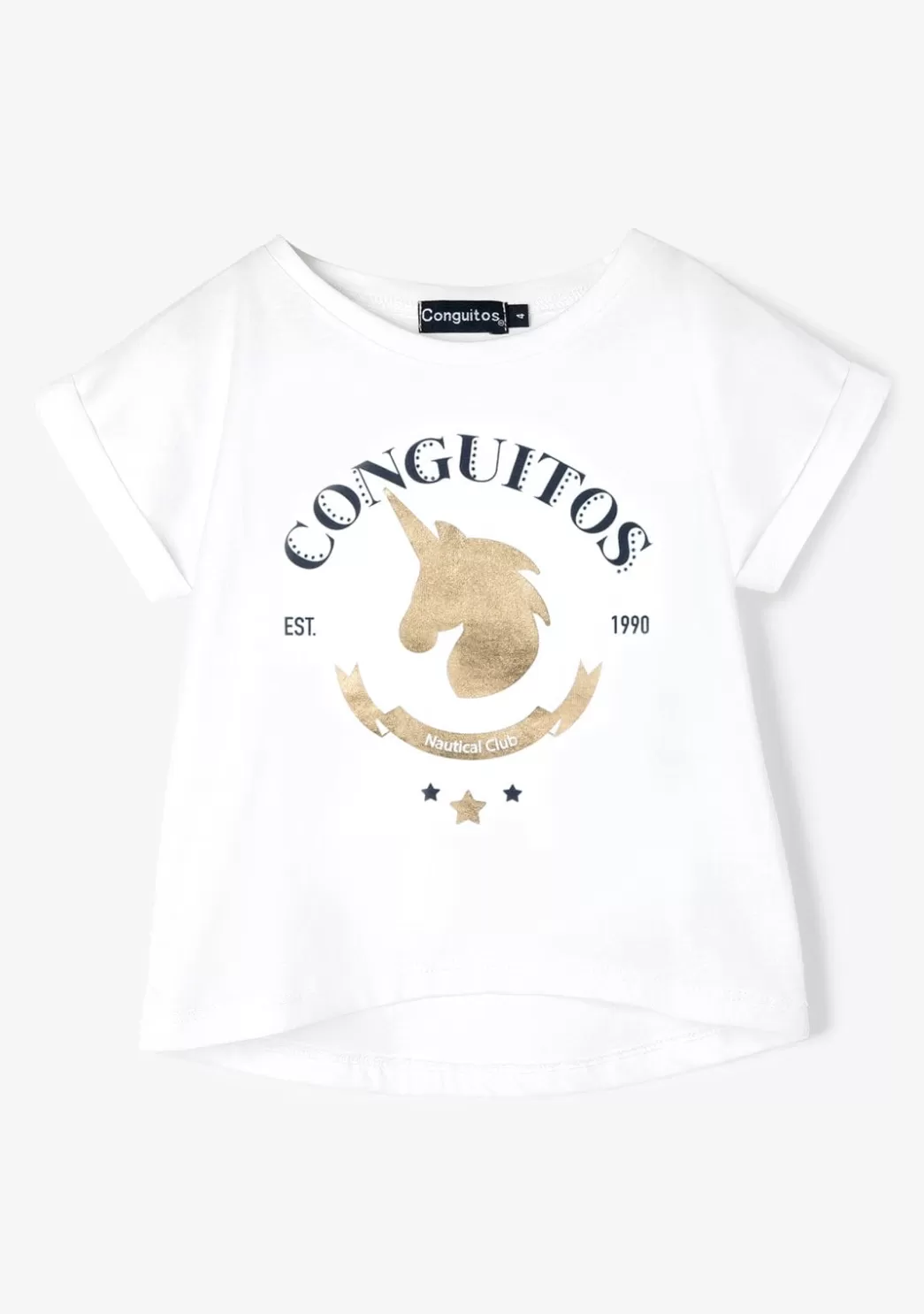 Este modelo es de manga recta y corta. Lleva un dobladillo en las mangas que le dan un toque cool. En la parte frontal tiene un estampado de unicornio y el emblema de Conguitos en dorado.