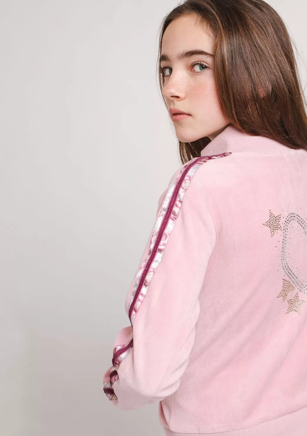 Sudadera de niña con cremallera fabricada en terciopelo de color rosa con banda lateral en las mangas combinado con print de flores y fucsia. Tiene bolsillos frontales y un corazón de strass en la zona de la espalda de la sudadera. Disponible el pantalón a conjunto para completar el chandal.