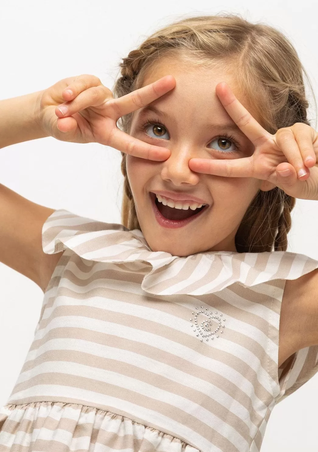 Vestido de niña de color blanco con rayas beige arena y volante en la parte superior, corte recto y falda con vuelo. Tiene el logotipo de Conguitos con strass en la parte frontal. Un bonito vestido perfecto para dar un toque de frescura en la época de primavera-verano por su tendencia marinera. También disponible con las rayas en color azul marino.