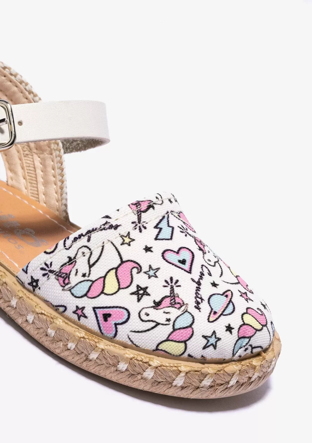 Alpargatas blancas para bebé con estampado de unicornio. Suela de yute y exterior de goma. Cierre de pulsera con hebill…