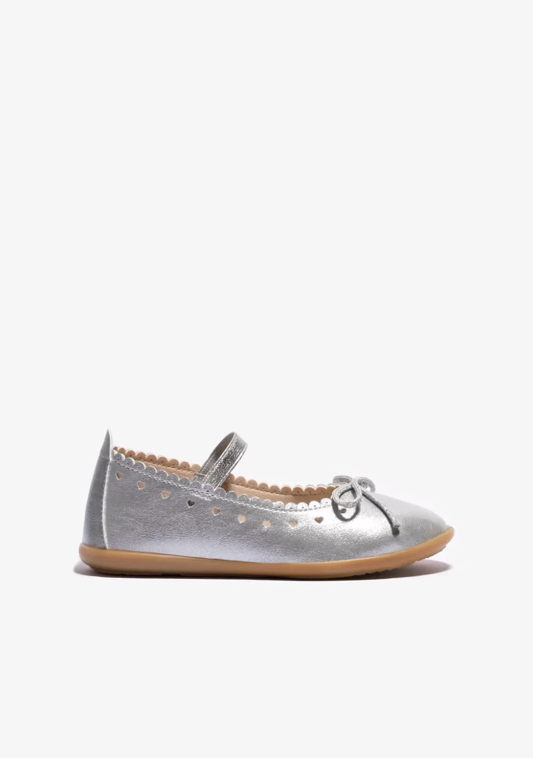 Estas bailarinas están decoradas con un lazo y un delicado troquelado con forma de corazón alrededor del borde. También, tienen el contorno con forma de ondas. Este modelo cuenta con una tira elástica en el empeine para mejorar la sujeción al pie.